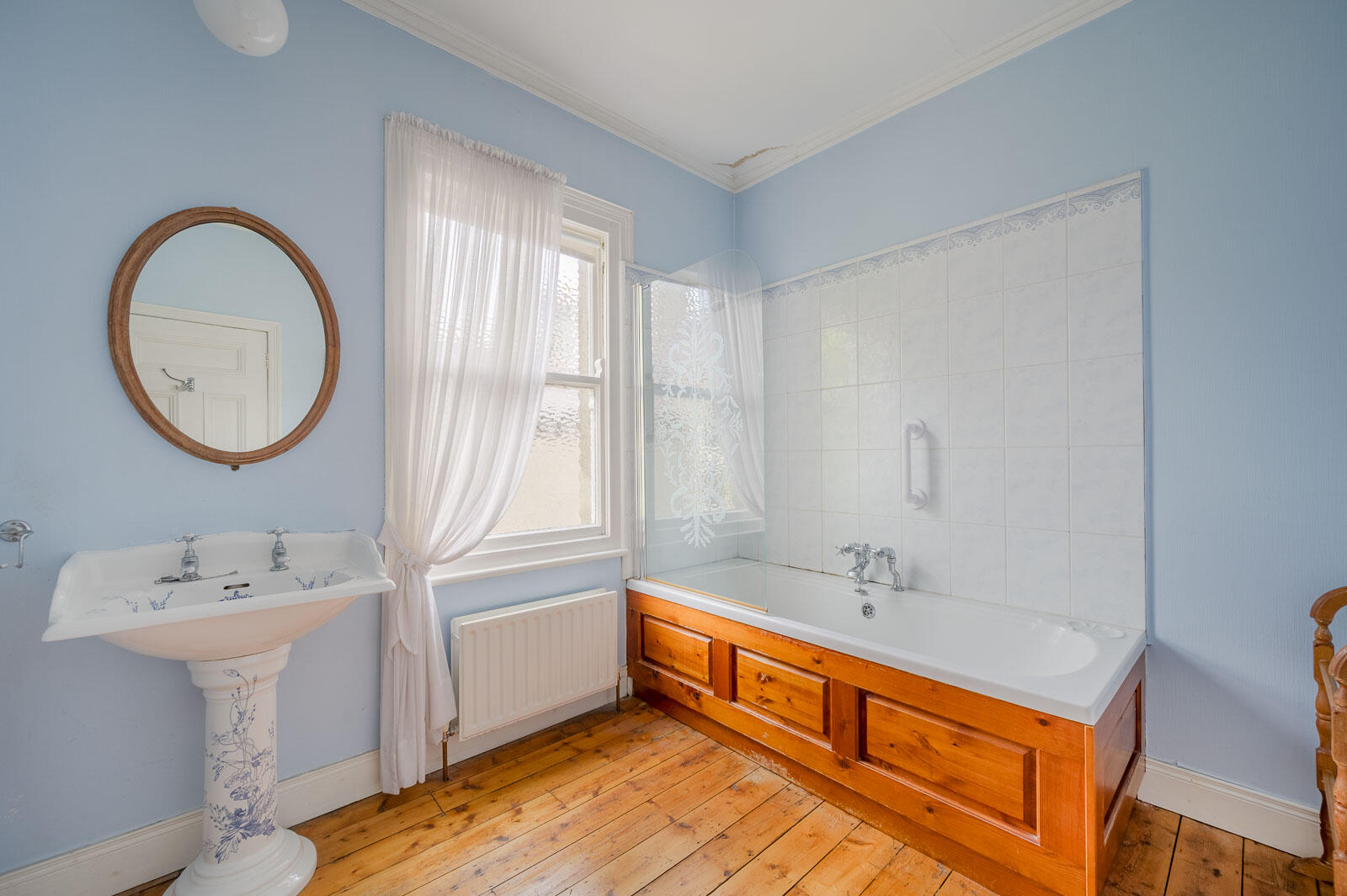 With Sanitan pedestal wash hand basin, hot and cold taps, Sanitan bath with mixer taps, timber panelled bath, thermostatically controlled shower with fixed attachment, partially tiled walls, glazed shower screen, chrome heated towel rail, exposed floorboards.