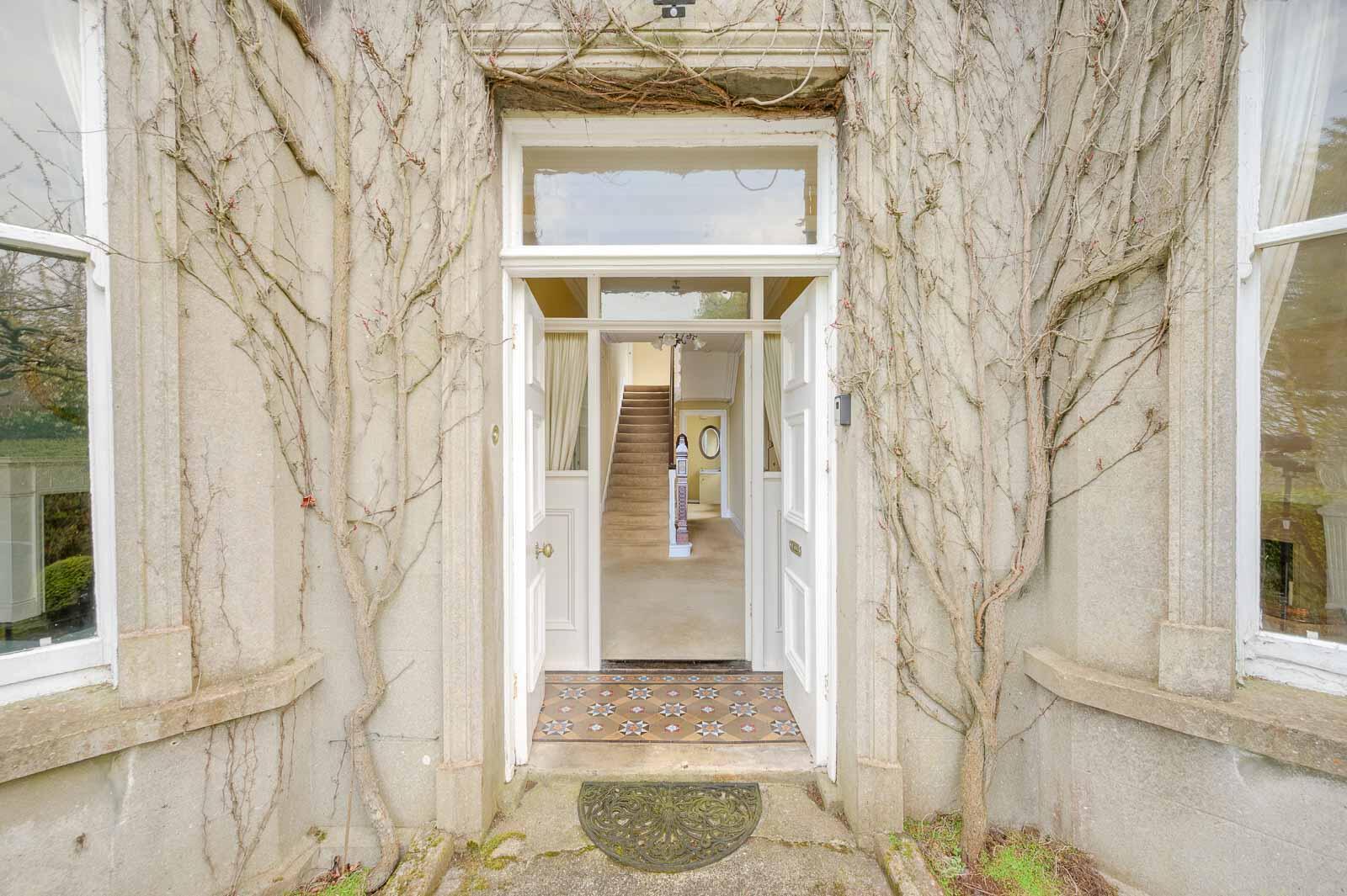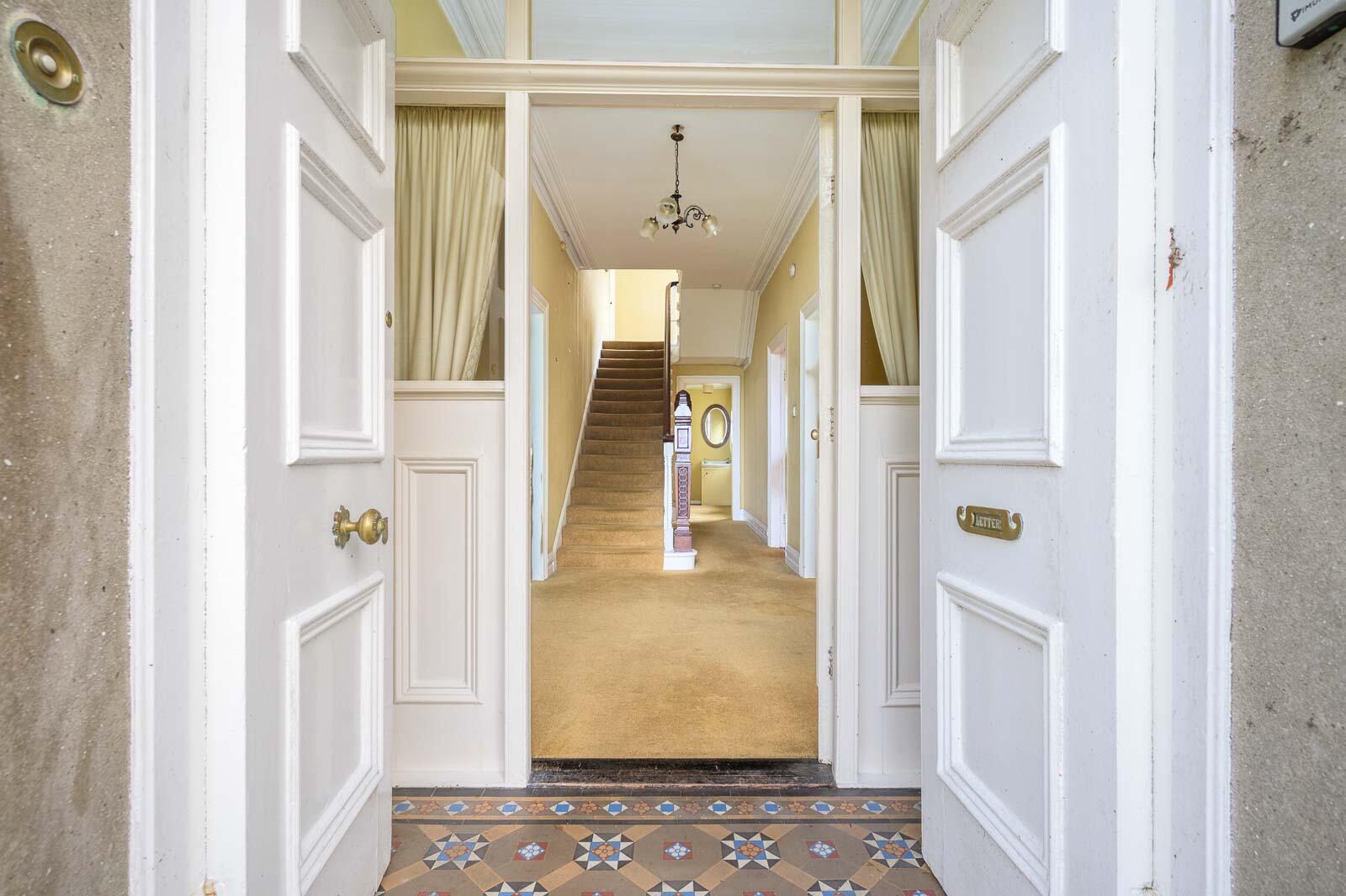 Reception porch featuring original Victorian tiled flooring, decorative cornicing