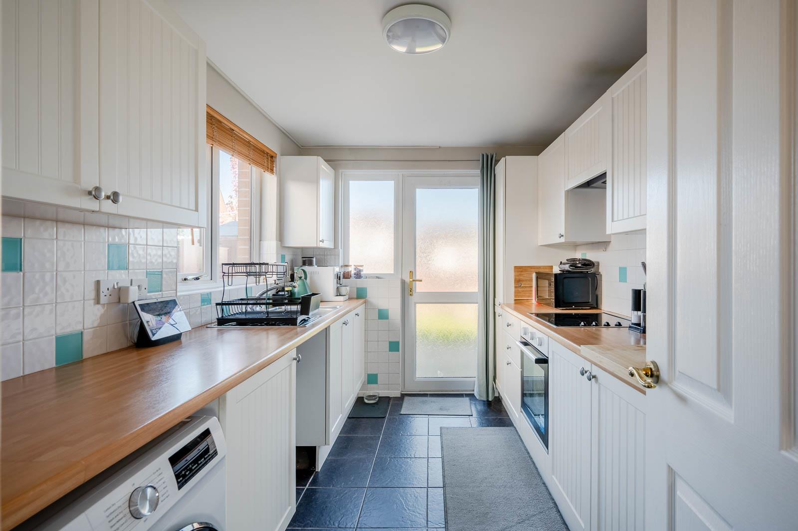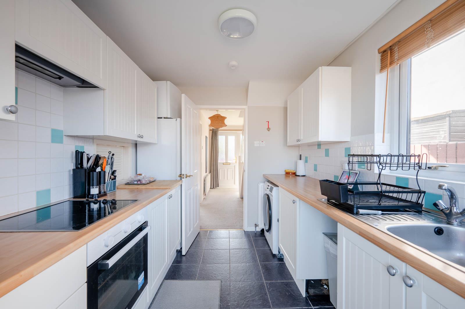 With range of high and low level units, laminate work surfaces, single bowl single drainer stainless steel sink unit with mixer tap, integrated four ring hob, tiled splashback, extractor fan above, integrated oven, recess for fridge freezer, plumbed for washing machine, fully tiled floor, part tiled walls, uPVC double glazed door to outside, service hatch to dining area.