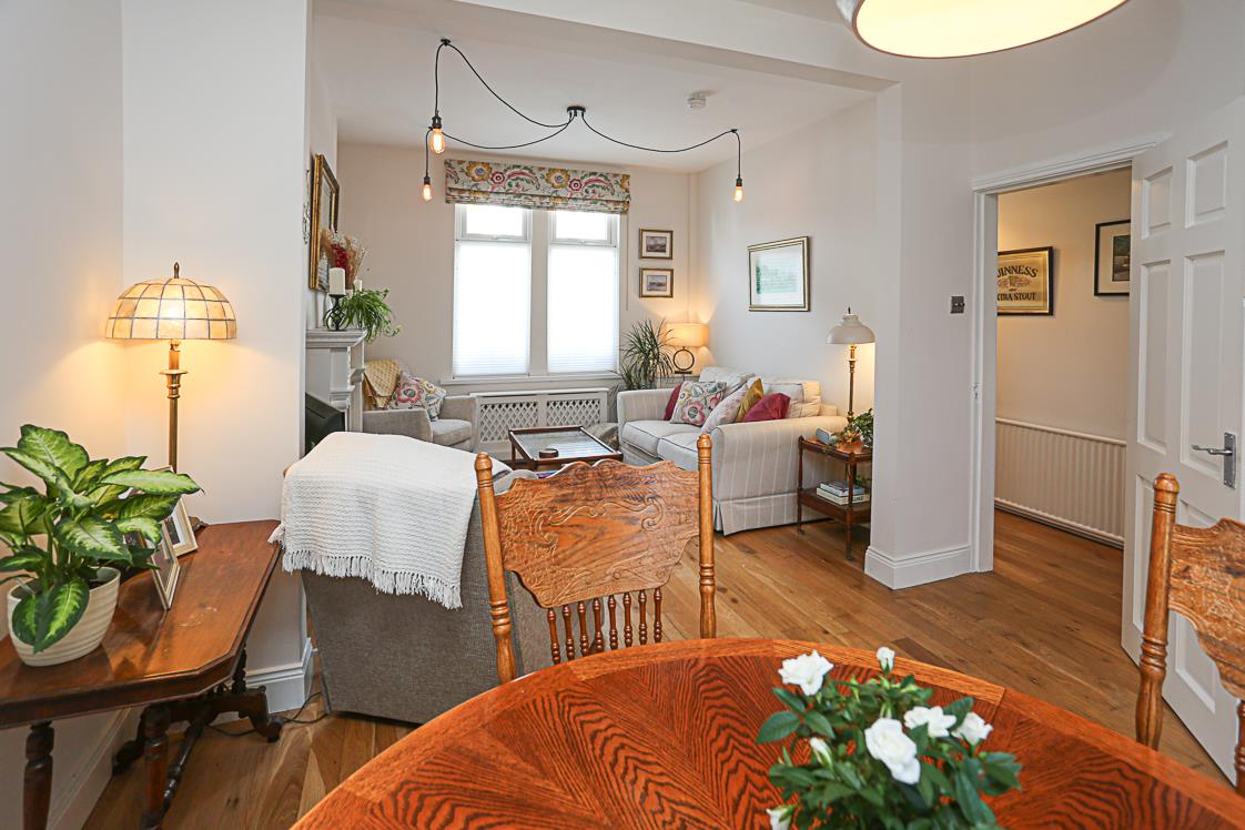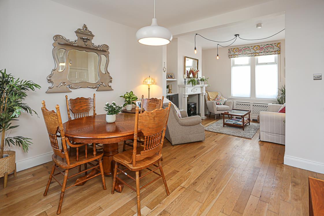 Through Lounge/Dining Room with Oak Wooden Flooring and Cast Iron Gas Coal Fire