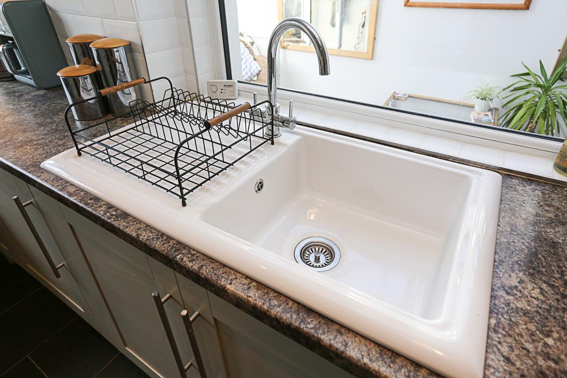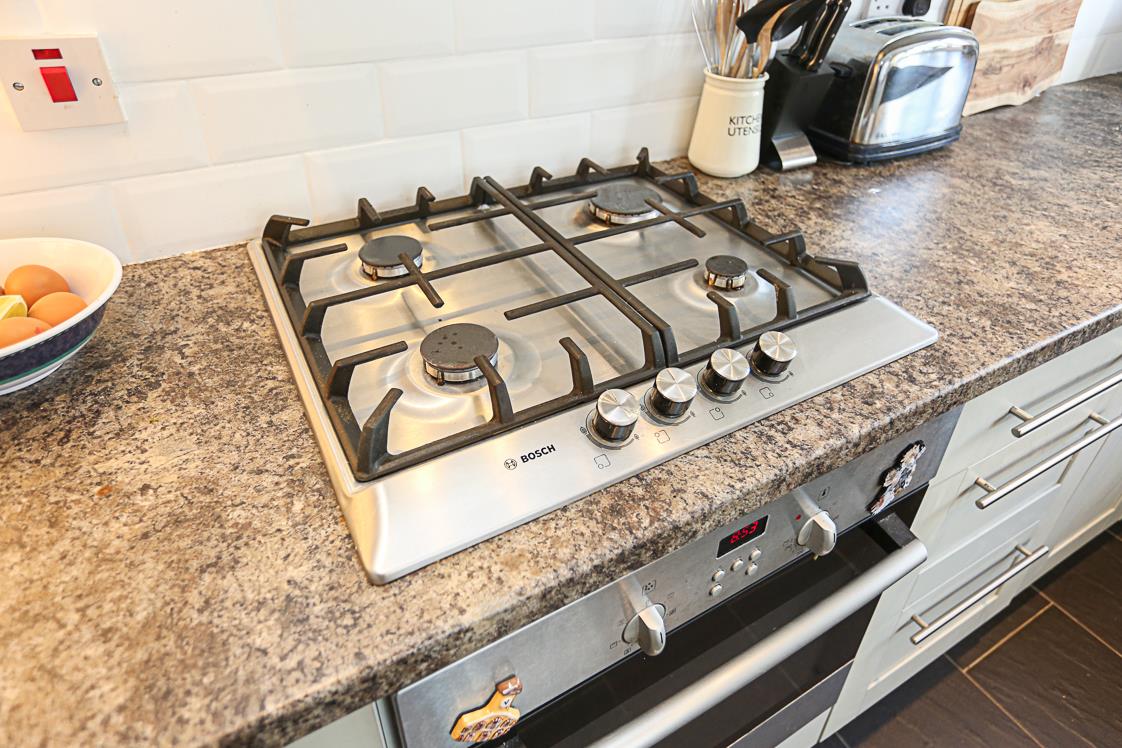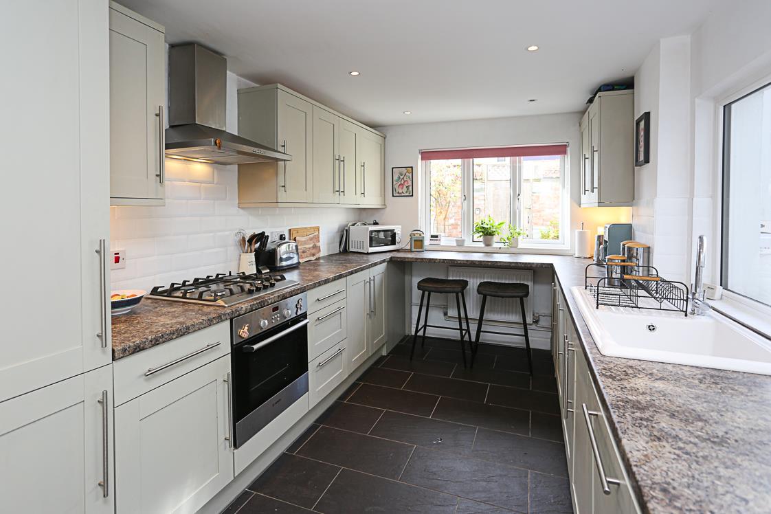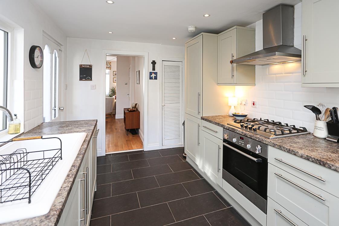 Excellent range of high and low level Shaker hand painted style units, stainless steel fittings, granite effect work surface, four ring stainless steel Bosch hob, stainless steel oven below, stainless steel extractor hood, subway part tiled walls, ceramic single drainer sink unit, integrated dishwasher, ceramic tiled floor, recessed spotlighting, fridge freezer, pantry cupboard and storage under stairs.
