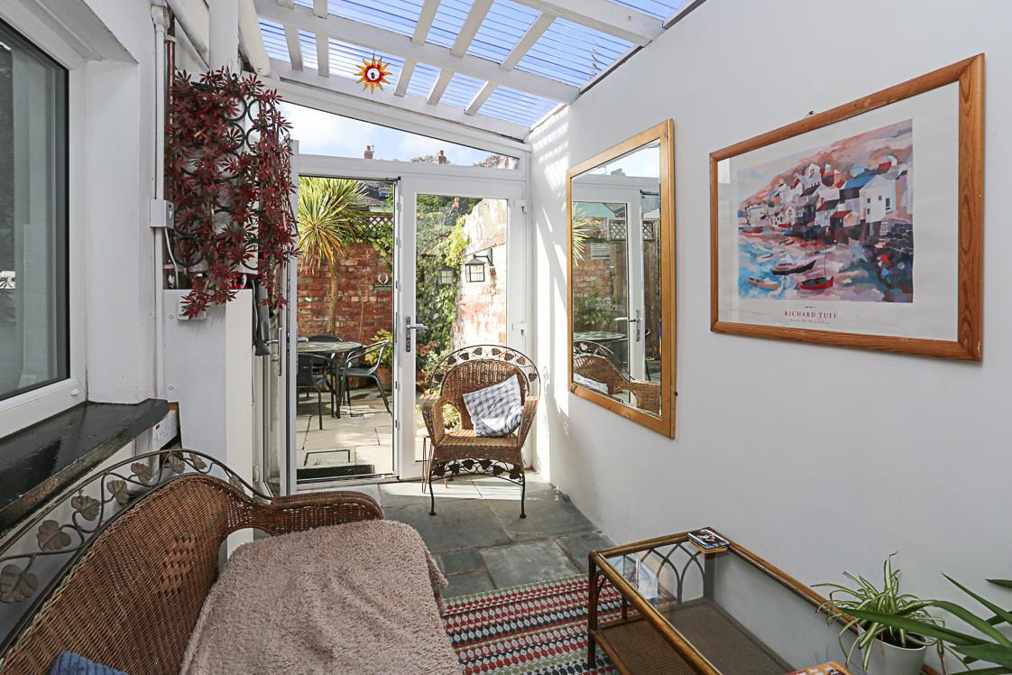 Stone paved floor, gas fired boiler, uPVC double glazed French doors to paved rear courtyard with planting and mature shrubs and bin access to rear, outside water tap.