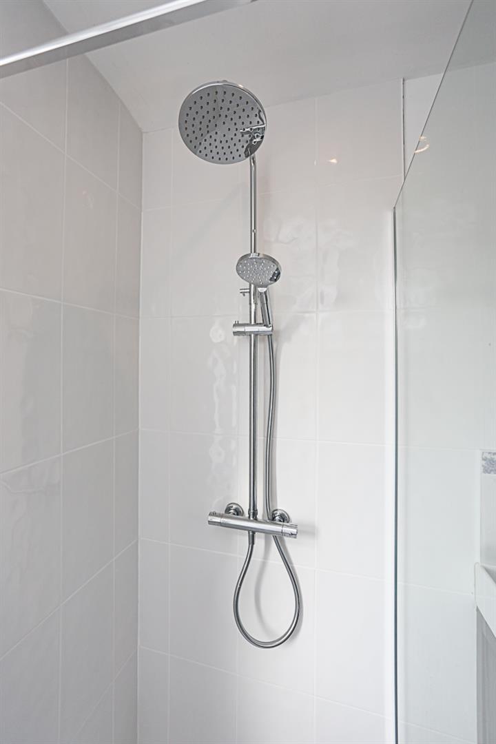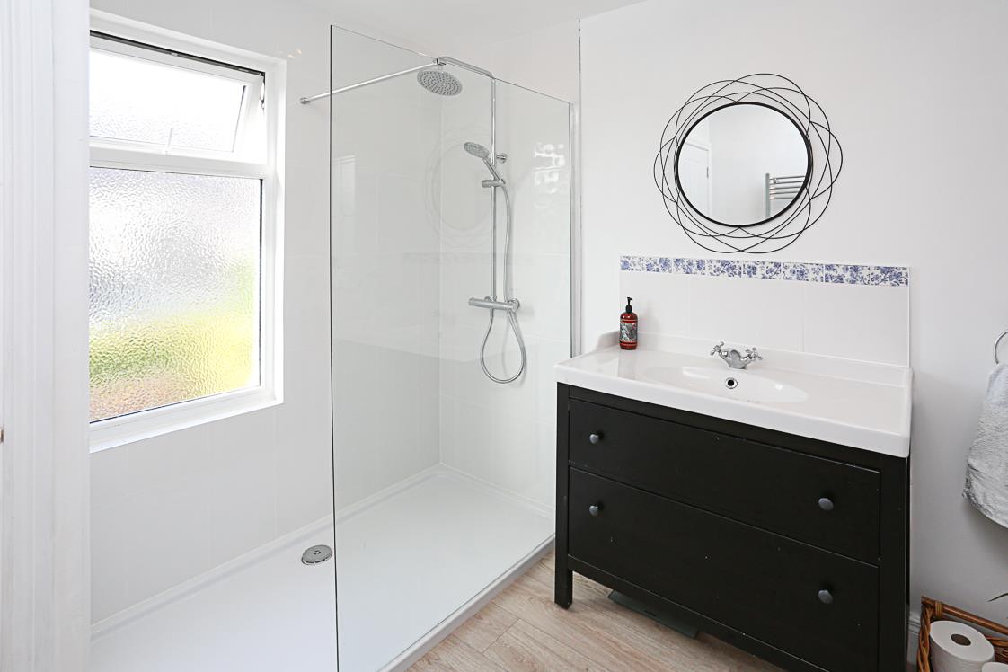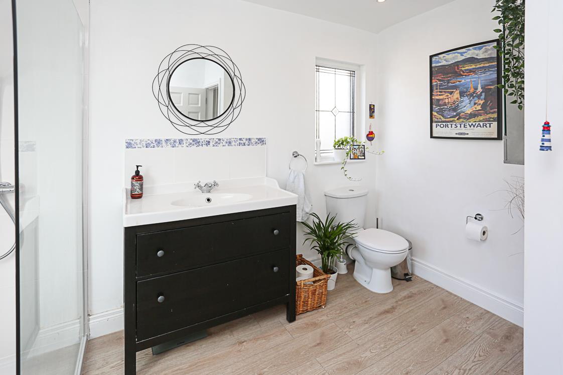 Modern white suite comprising: low flush WC, vanity unit, drawer units below, panelled bath, chrome mixer taps, tiled splashback, thermostatically controlled shower unit, glazed shower screen, plumbed for washing machine, leaded window to side, access hatch to roof void.