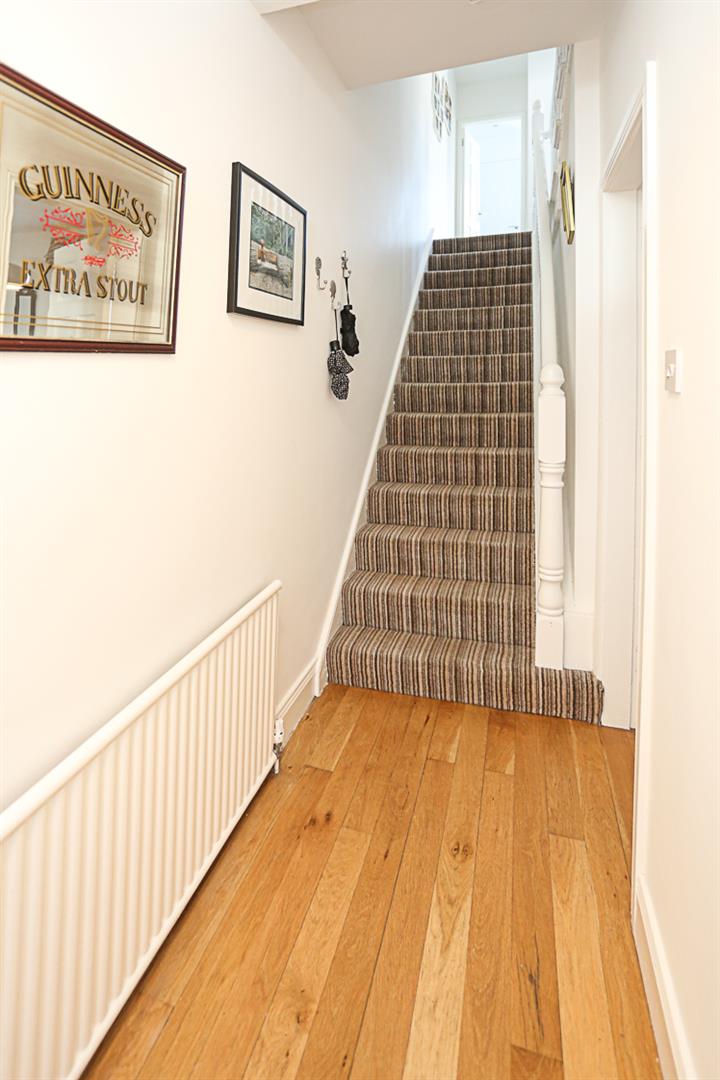 Oak wooden flooring, radiator cover, cornice ceiling.