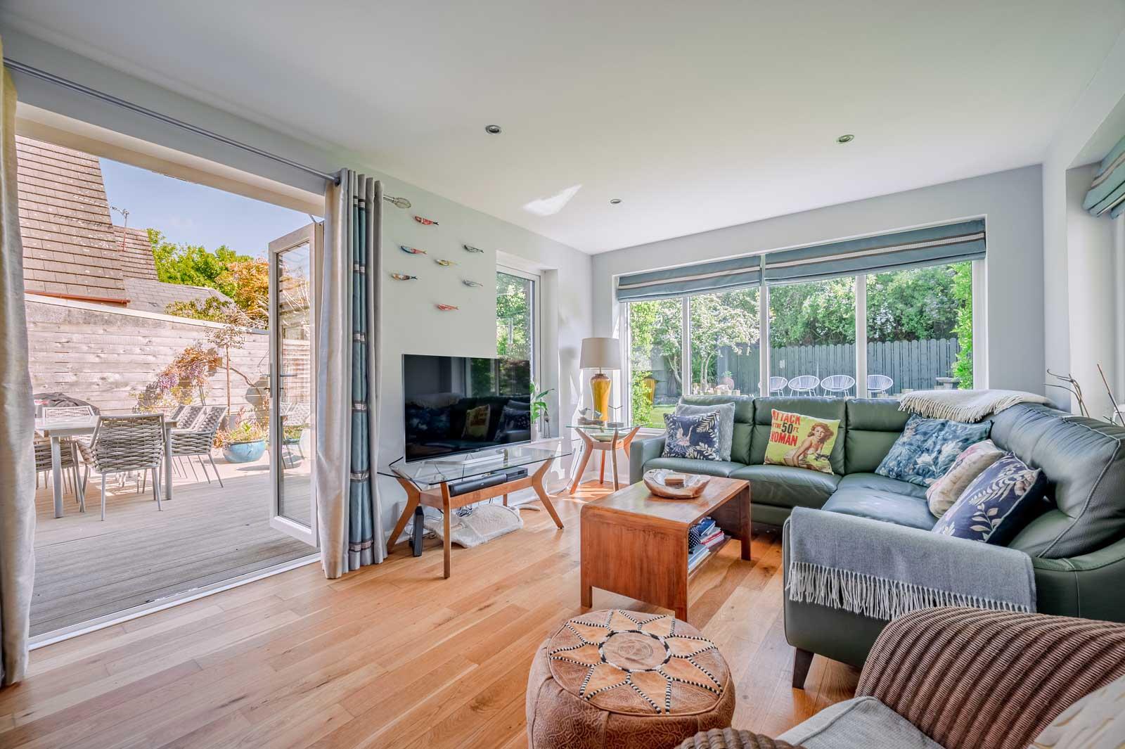 Solid oak wooden floor, uPVC double glazed French doors to rear garden.