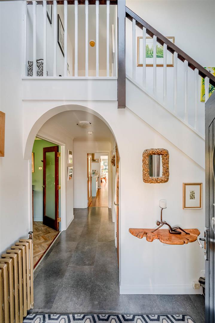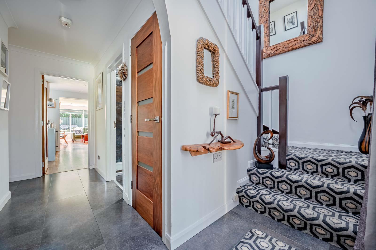 Laminate tile effect floor, storage under stairs, cornice ceiling.