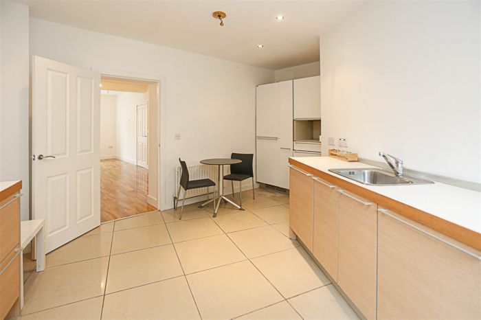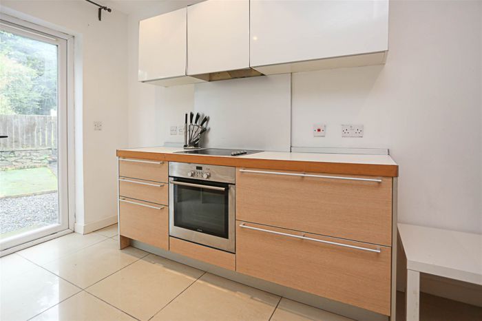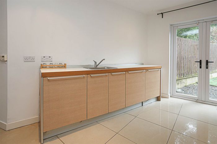 Porcelain tiled floor, range of high and low level units, Siemens" integrated oven, four ring hob, concealed extractor above, stainless steel splashback, hardwood work surface, integrated washing machine, integrated dishwasher, stainless steel sink with mixer taps, uPVC and double glazed access door through to rear garden, inset spotlights.