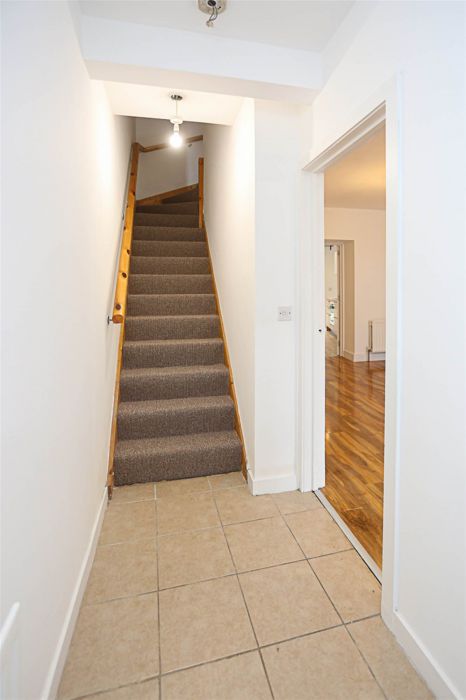 With outlook to front, laminate wood effect floor, storage under stairs with cloaks.