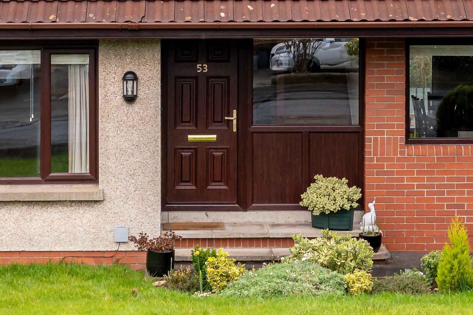 Front door with double glazed side panel to reception hall.