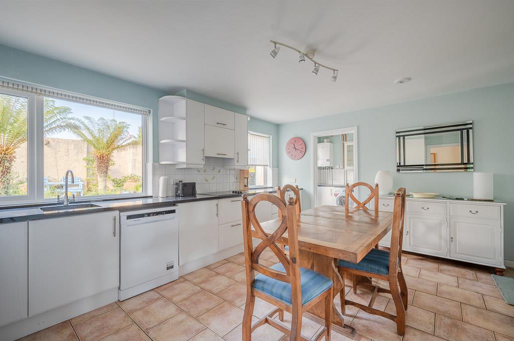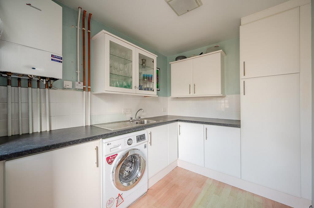 Storage cupboards, granite effect work surfaces, single bowl single drainer stainless steel sink unit, mixer tap, plumbed for washing machine, gas fired boiler, glass display cabinets, double glazed door to outside.