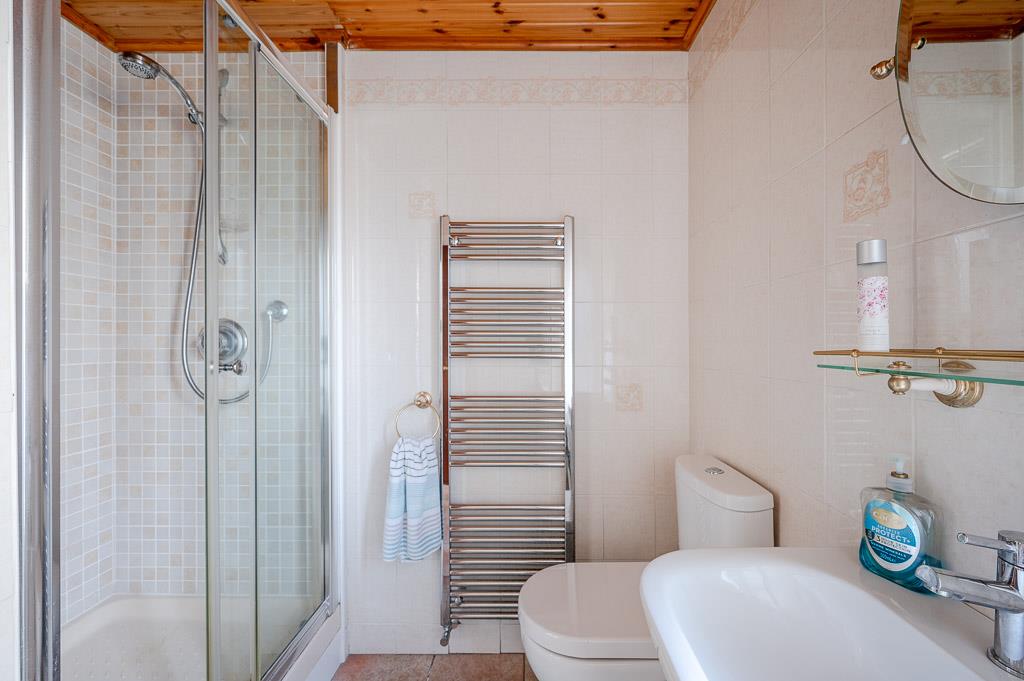 Three piece suite comprising built-in fully tiled shower cubicle, pedestal wash hand basin with mixer tap, low flush WC, fully tiled floor, part tiled walls, chrome heated towel rail, tongue and groove ceiling.