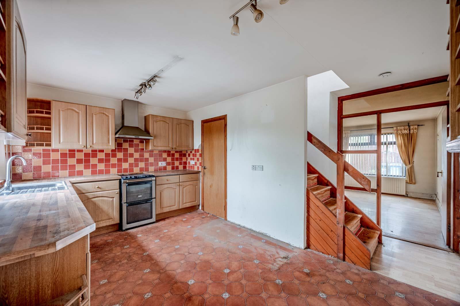 Range of high and low level units, laminate work surfaces, single bowl single drainer stainless steel sink unit with mixer tap, space for cooker range, tiled splashback, extractor fan above, storage cupboard under stairs, plumbed for washing machine, part tiled walls.