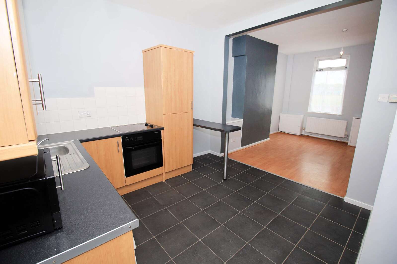 Ground floor: Living room open plan to kitchen, rear hall, bathroom.