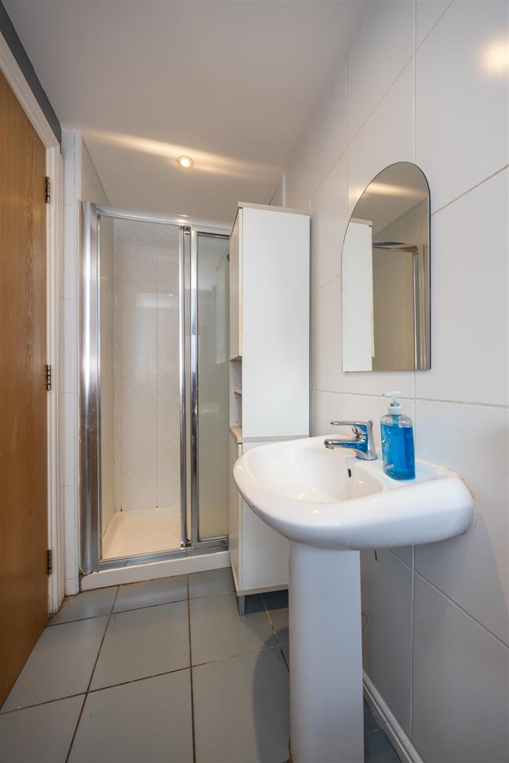 Comprising shower cubicle, pedestal wash hand basin, low flush WC, part tiled walls, fully tiled floor.