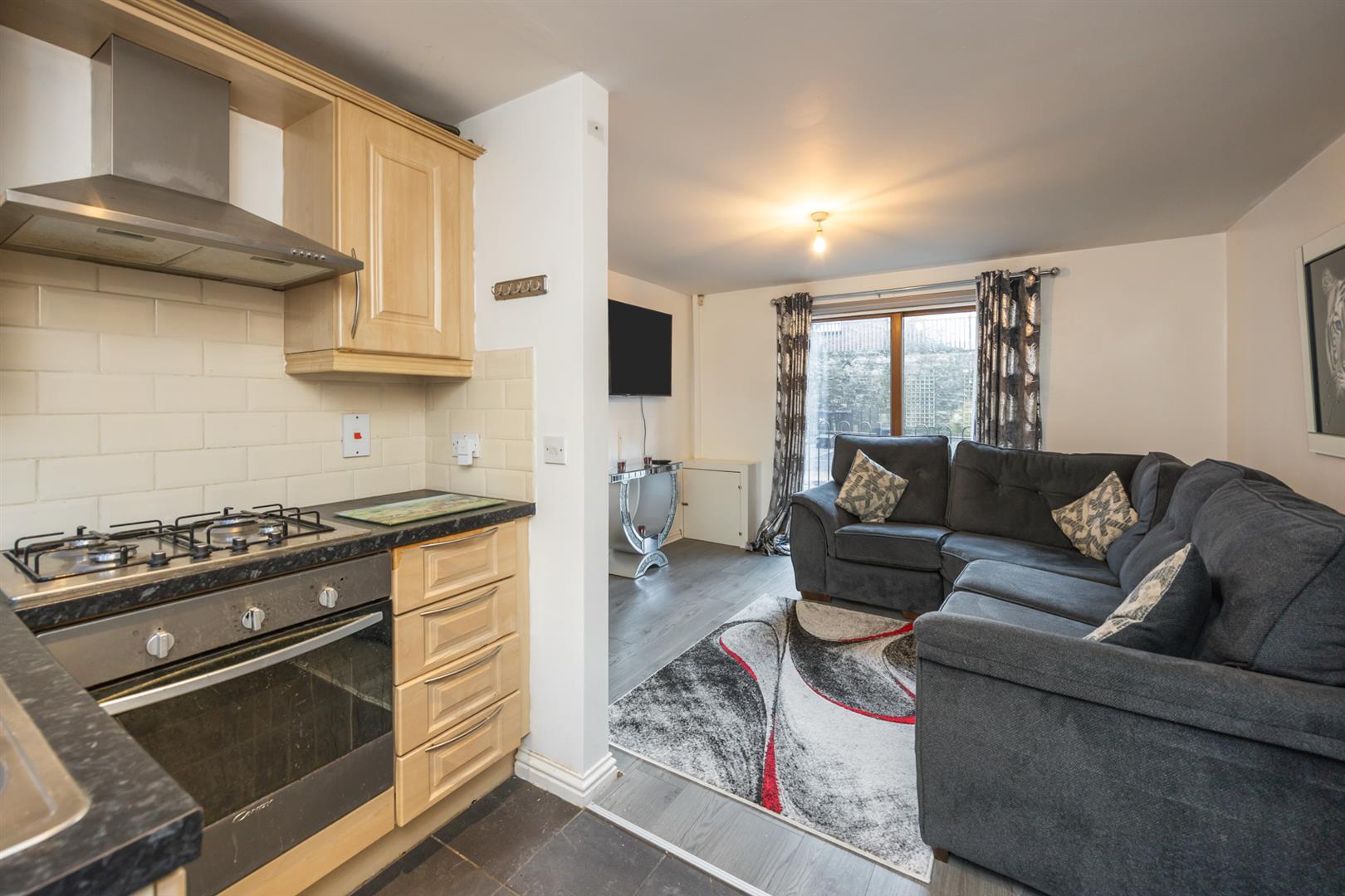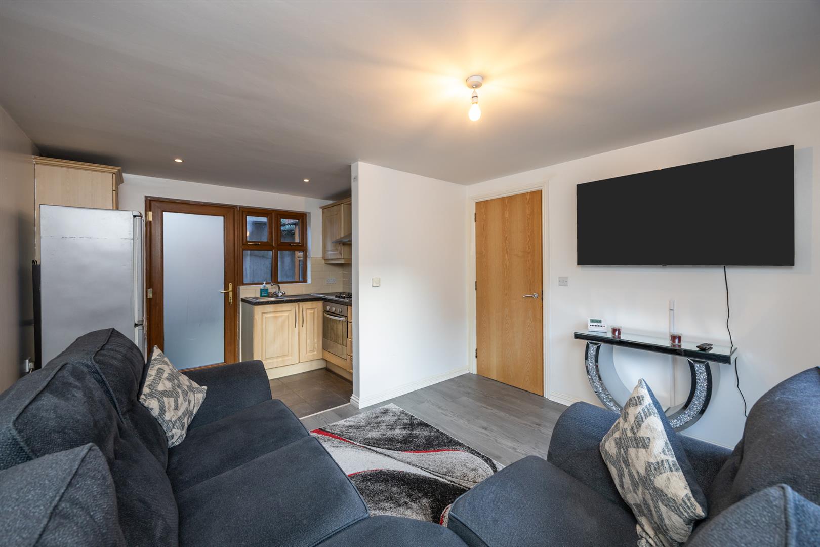 The accommodation comprises a bright living room with laminated wood flooring that flows seamlessly into the kitchen, complete with a range of high and low-level units, stainless steel oven and gas hob, a good size double bedroom, and a white shower room suite with tiled floor. Outside, the property benefits from parking to the front and a private paved patio to the rear. Other benefits include gas fired central heating and uPVC double glazed windows.