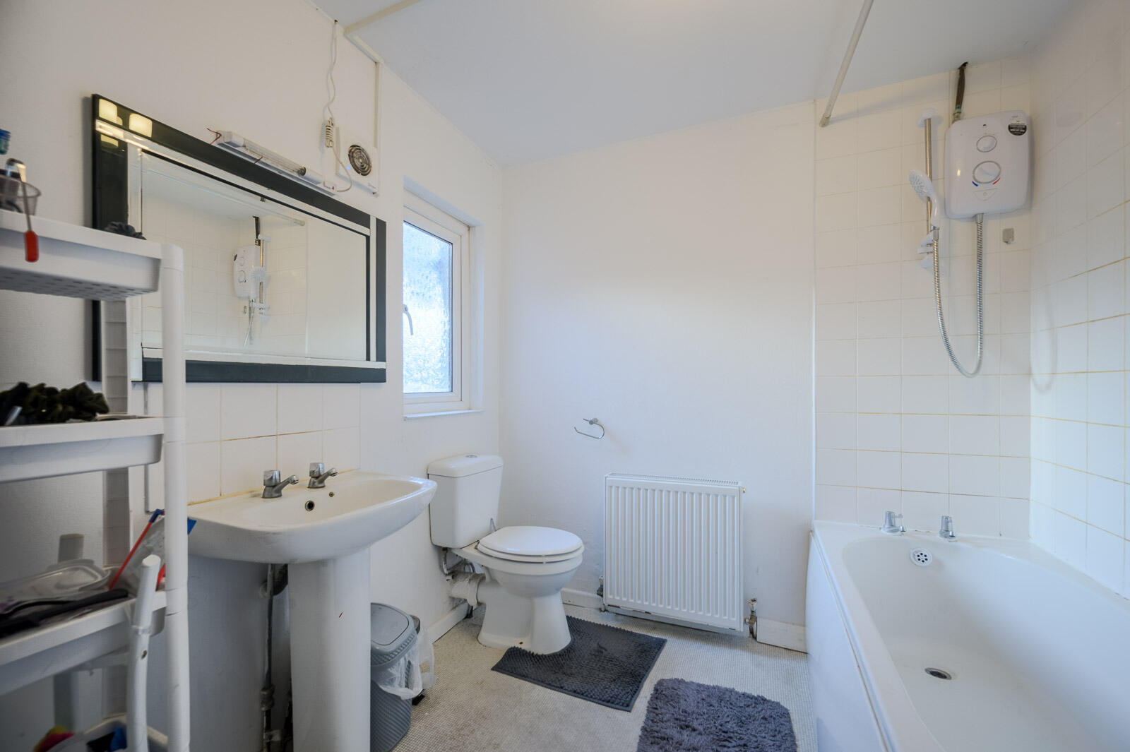 White suite comprising: panelled bath with chrome taps, electric shower above, low flush wc, pedestal wash hand basin, part tiled walls, hot press with copper cylinder.