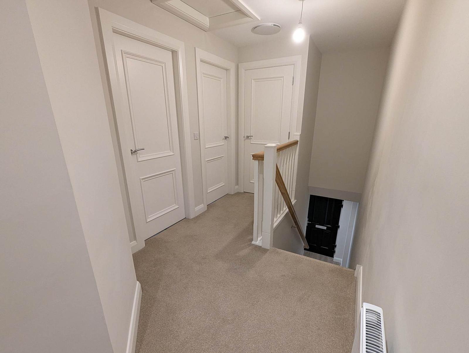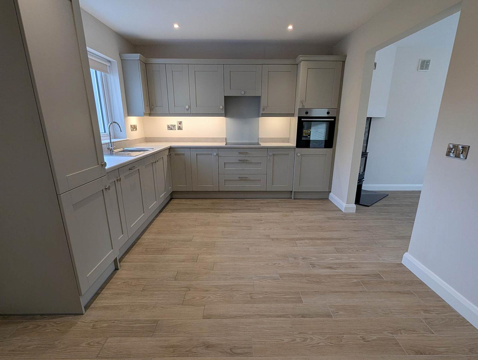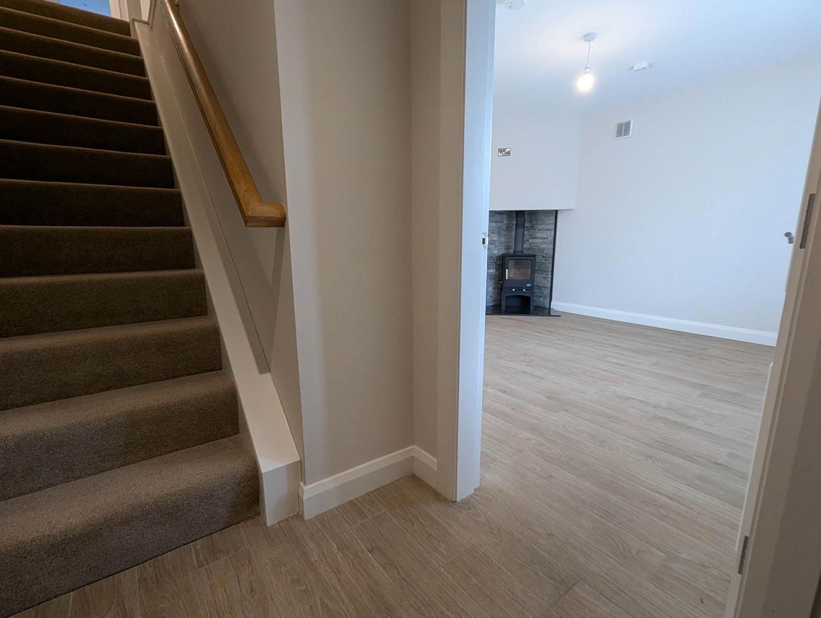The ground floor offers a comfortable front living room along with a kitchen and dining area fitted with built-in appliances. There is also a utility room and a downstairs toilet. The property benefits from underfloor heating on the ground floor, a multi-burn stove, and oil-fired central heating, with temperature control throughout. Solar panels have also been installed.
