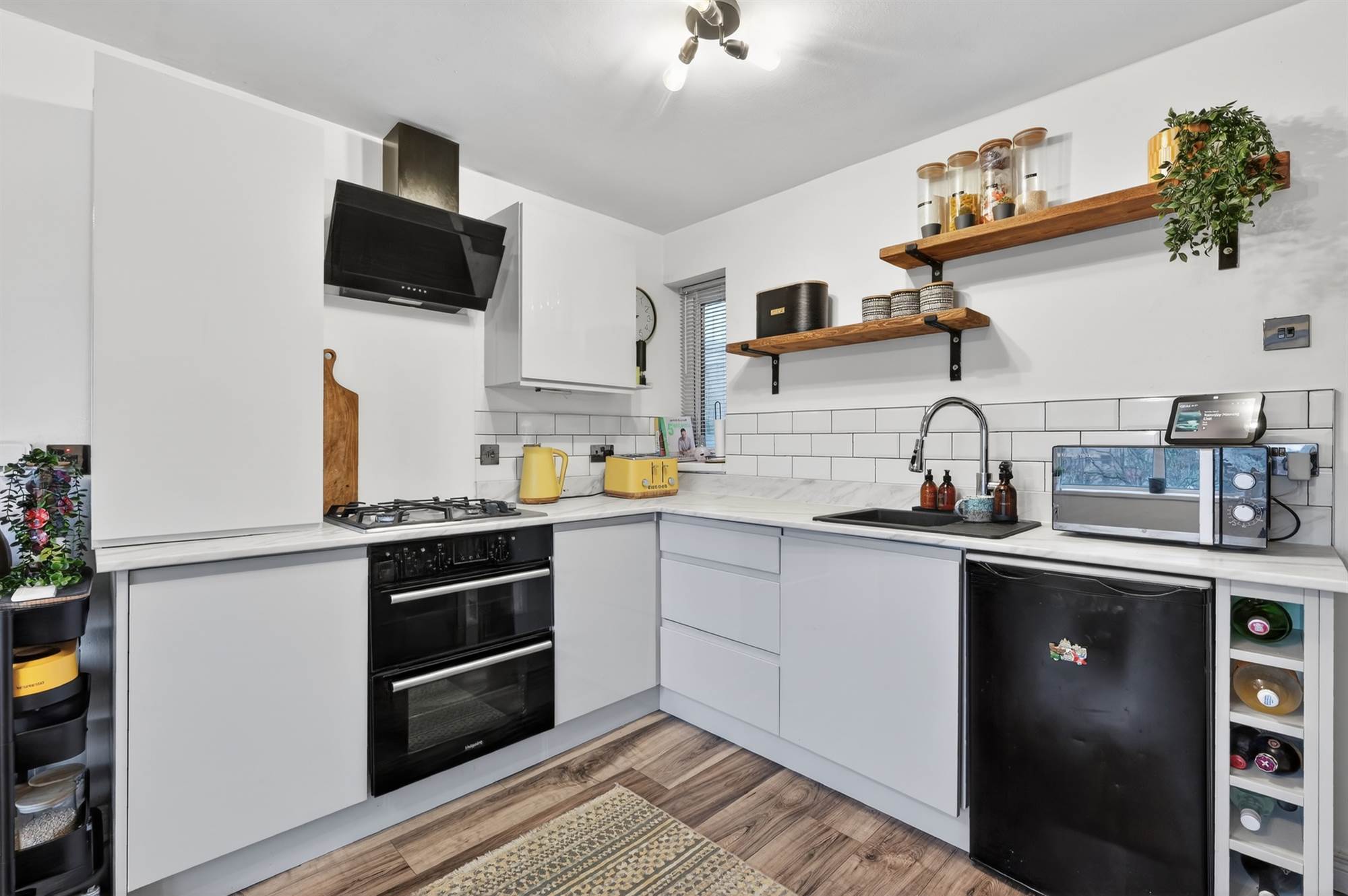At widest points, into bay. High gloss kitchen with range of high and low level units, work surfaces, black sink, integrated wine rack, gas boiler, integrated Beko 4 ring gas hob, integrated Hotpoint oven, extractor fan over, glazed splashback,part tiled walls, laminate wood effect floor, bay window.