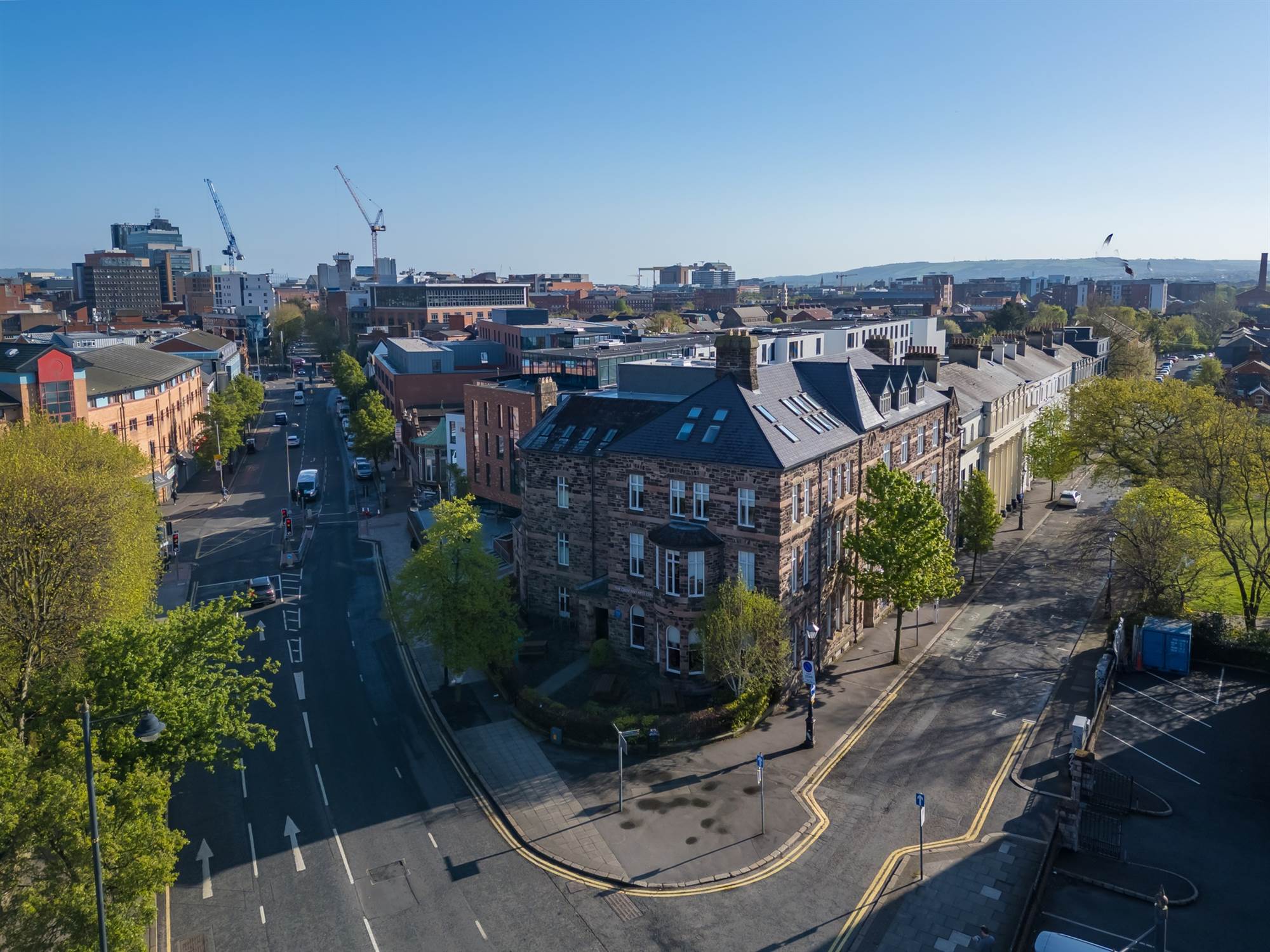 Malone Road heading towards Shaftsbury Square just before Bradbury Place turn left into Development.