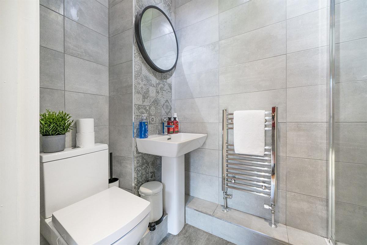 White suite comprising fully tiled shower cubicle, wash hand basin and low flush W/C. Extractor fan.