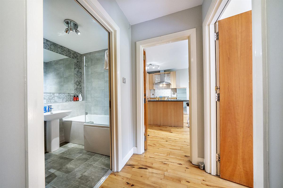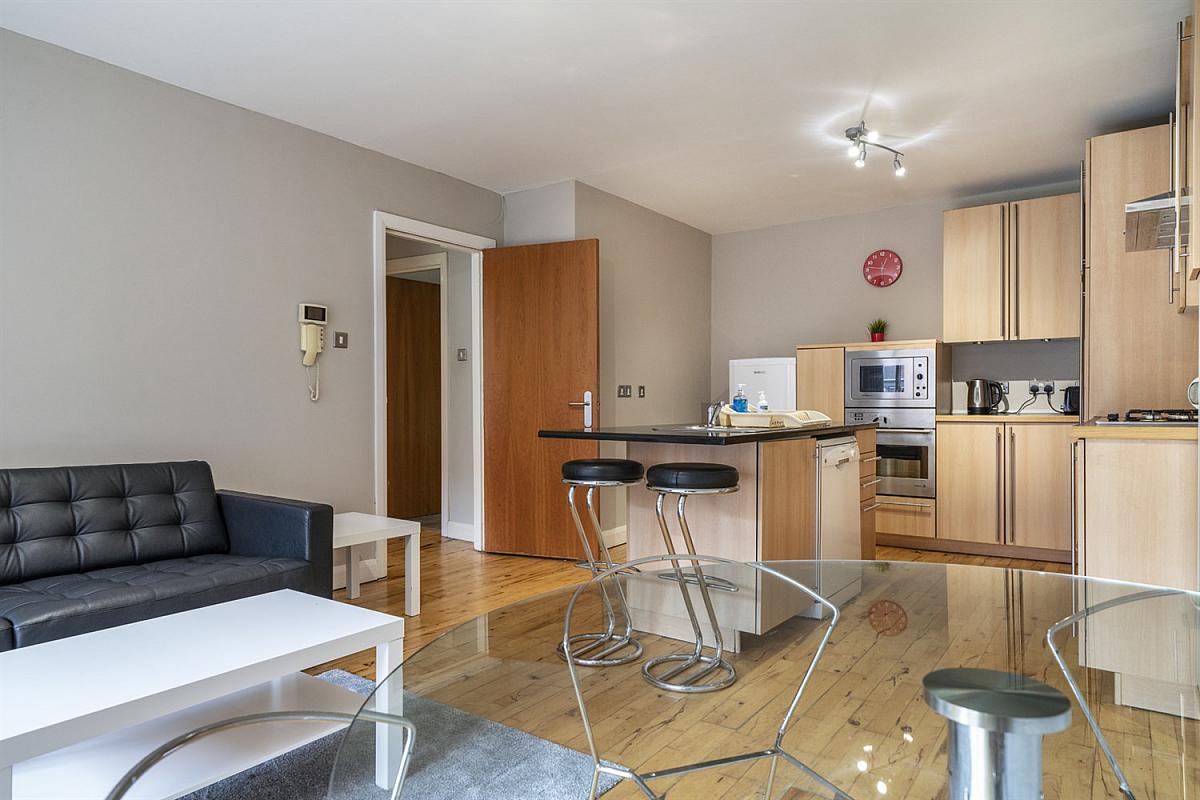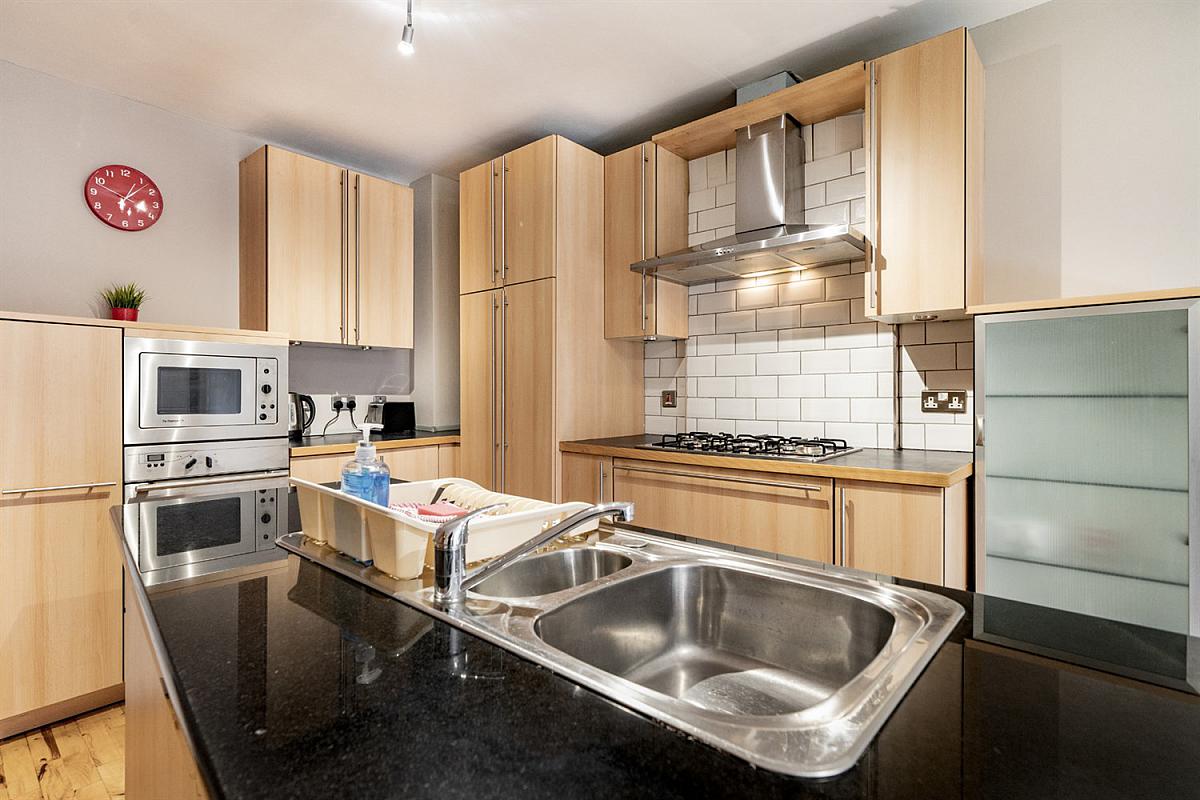 Excellent range of high and low level units. Island unit. 1½ stainless steel sink unit with drainer and mixer tap. Built in gas hob, stainless steel extractor fan. Integrated electric oven, microwave oven and dishwasher. Granite worktop surfaces. Solid wood floors. Gas wall mounted boiler. Access to balcony.