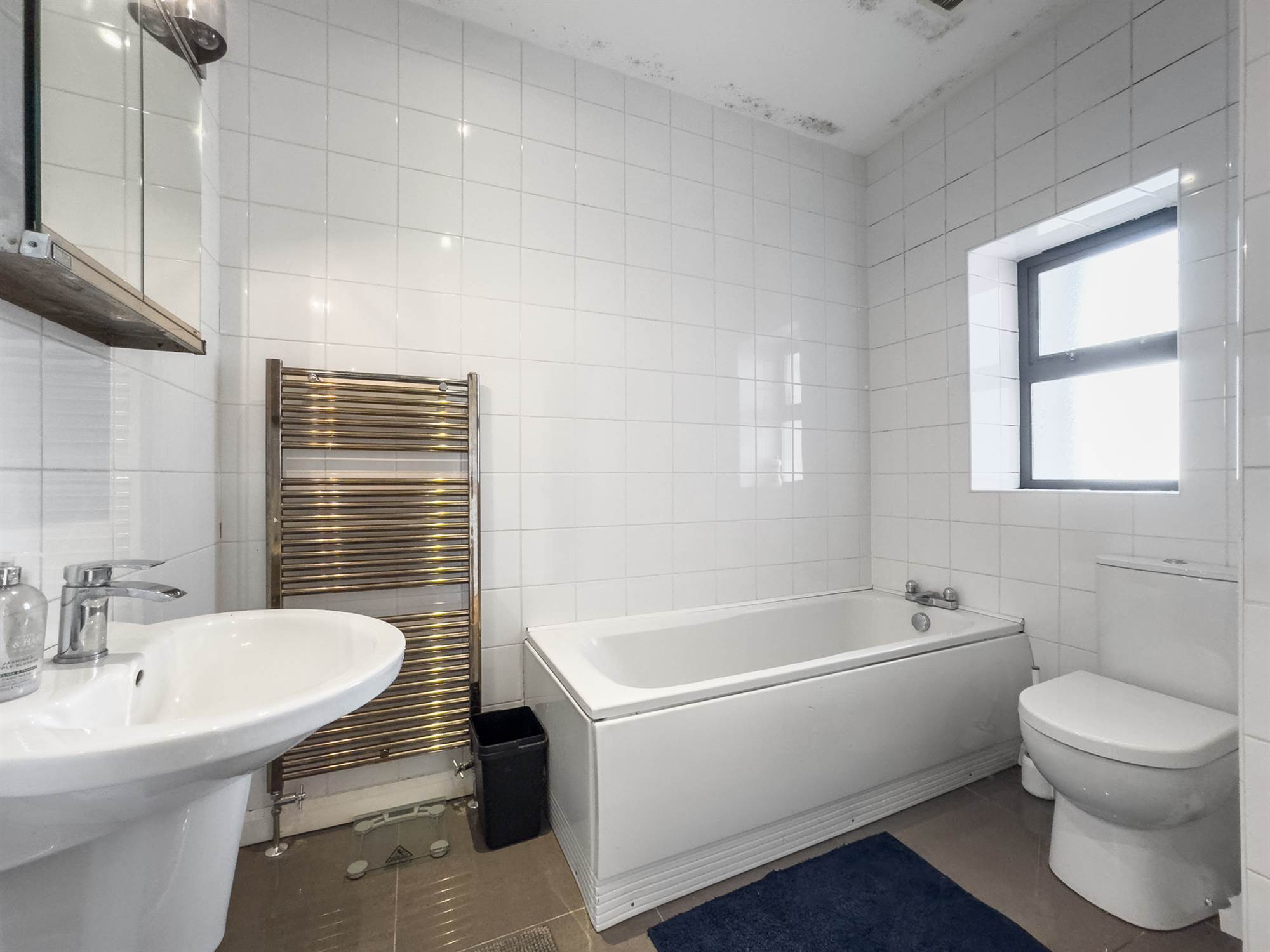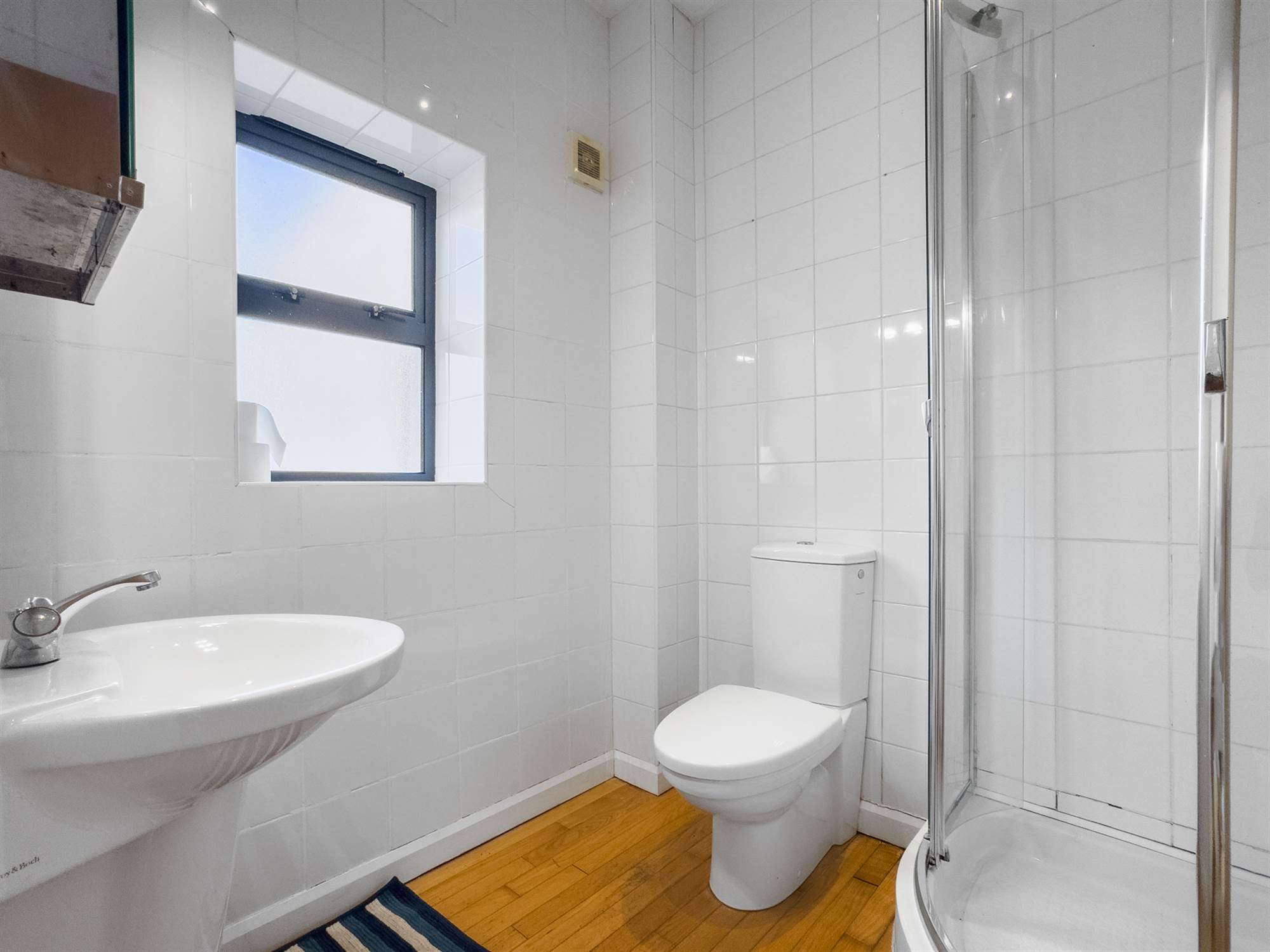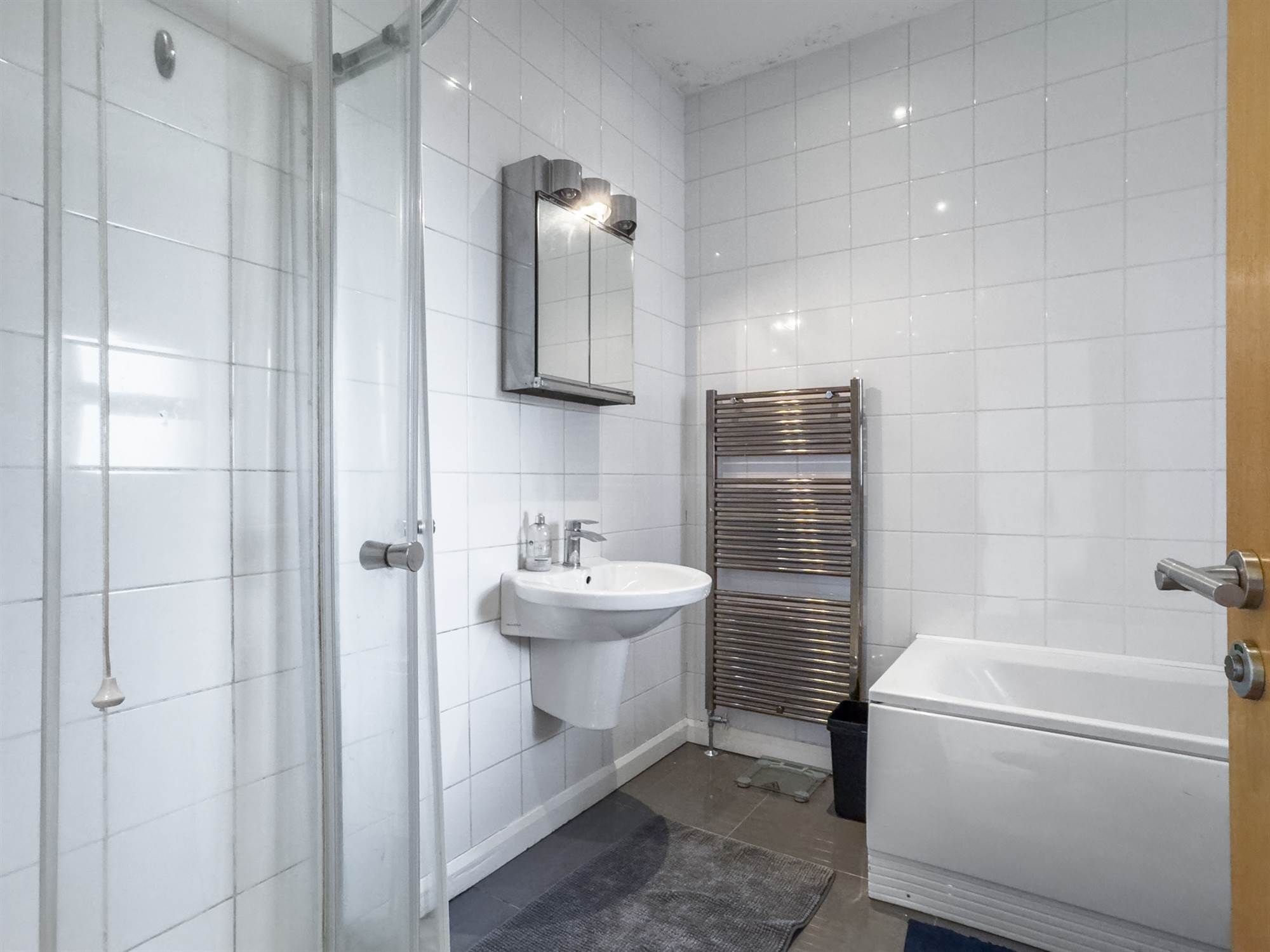 White suite comprising: panelled bath with mixer taps, low flush WC, semi pedestal wash hand basin with mixer taps, fully tiled shower cubicle with thermostatic shower, chrome towel radiator, fully tiled walls, ceramic tiled floor.