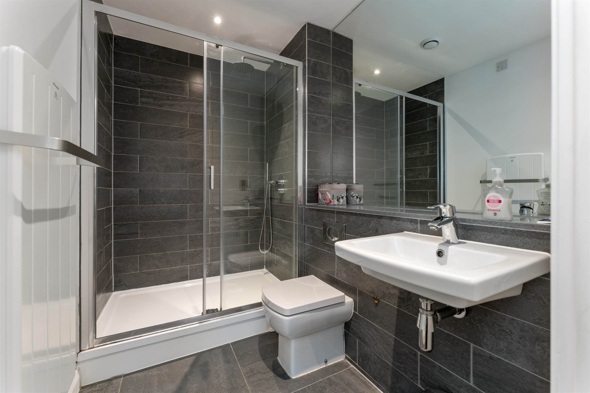 White suite comprising, low flush WC with wall hung push button, floating wash hand basin with chrome mixer taps, double shower with chrome thermostatic control valve, telephone attachment and rainfall head, low voltage recessed spotlighting, heated towel rail, built in mirror and quartz worktop. Shaving point, partly tiled walls and tiled floor.