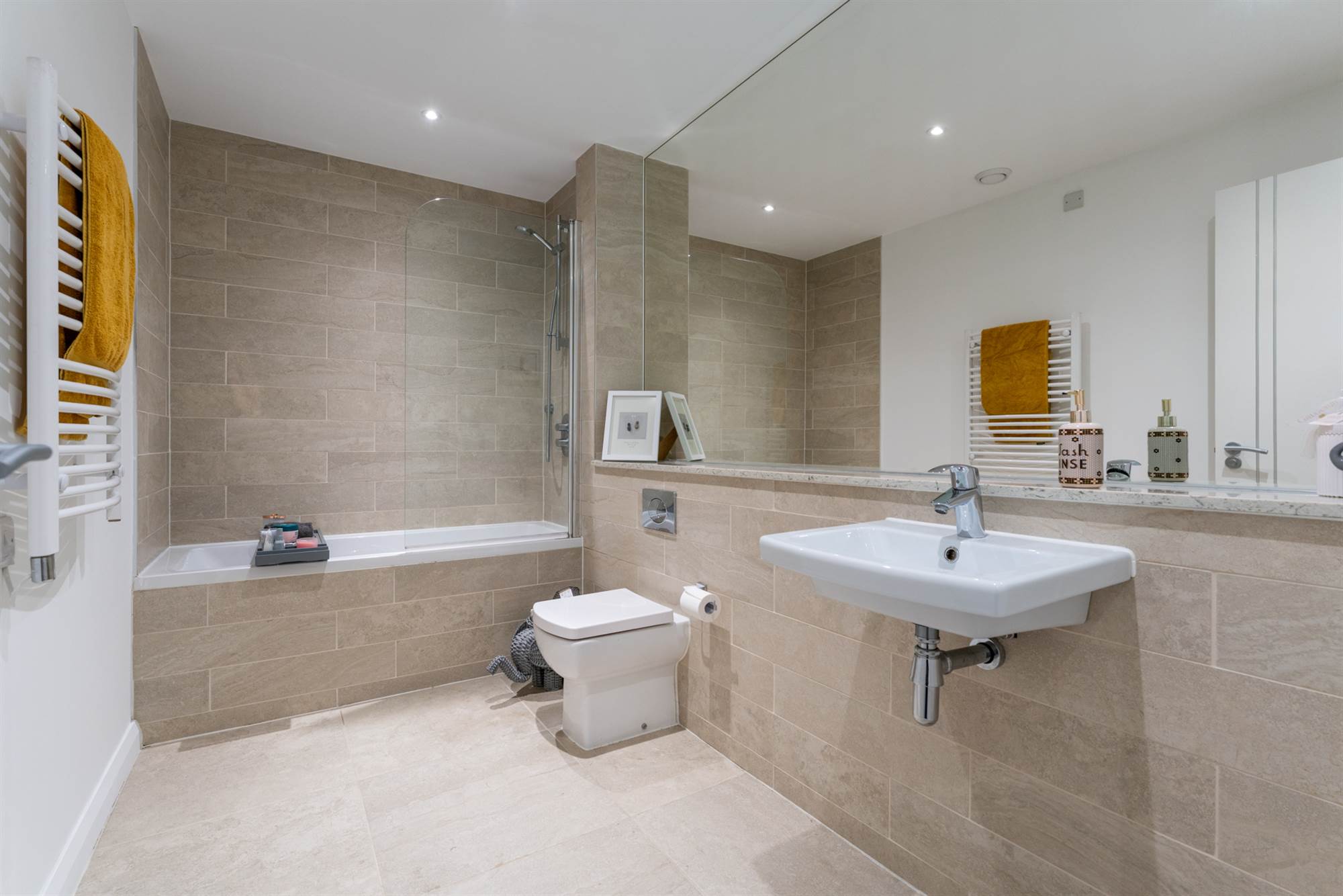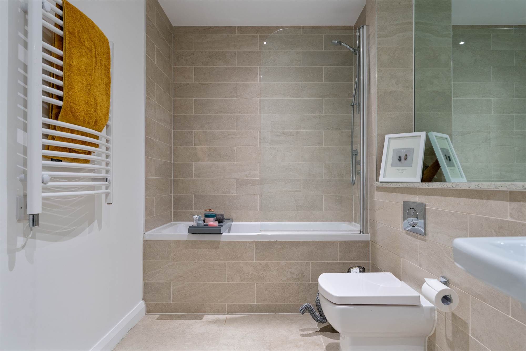 White suite comprising, low flush WC with wall mounted push button, floating wash hand basin with chrome mixer tap, fully tiled walls, tiled floor, tiled pannelled bath with fixed glass door, chrome thermostatic control valve and telephone attachment. Built in mirror, quartz worktop and heated towel rail, low voltage recessed spotlighting and heat recirculation system.