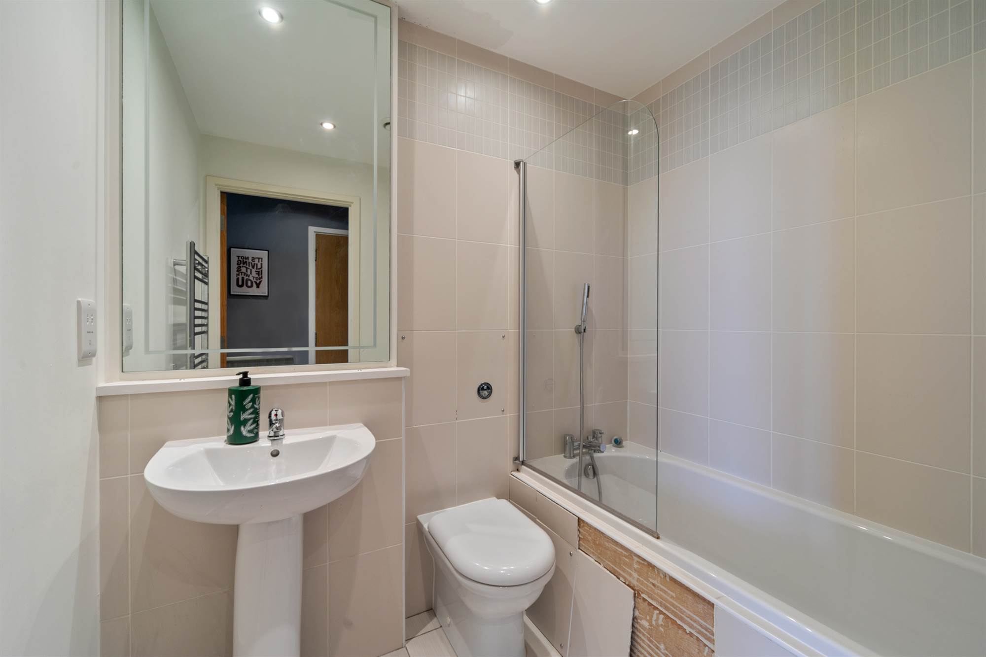 Bath with tiled surround and telephone hand shower. Low flush WC. Pedestal wash hand basin. Chrome heated towel rail. Low voltage spotlights. Ceramic tiled floor.