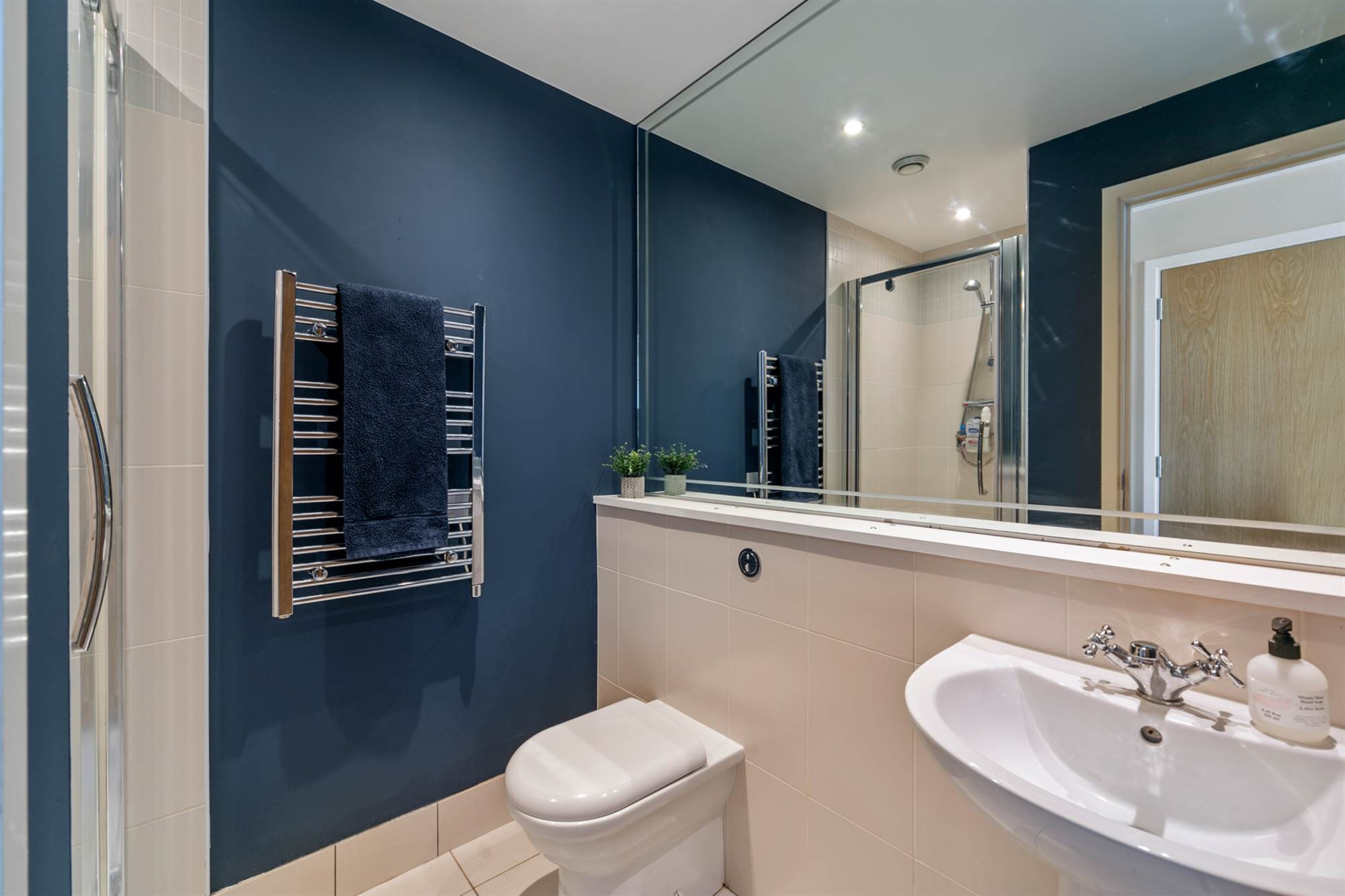 Fully tiled corner shower unit. Low flush WC. Pedestal wash hand basin. Chrome heated towel rail. Part tiled walls. Ceramic tiled floor.