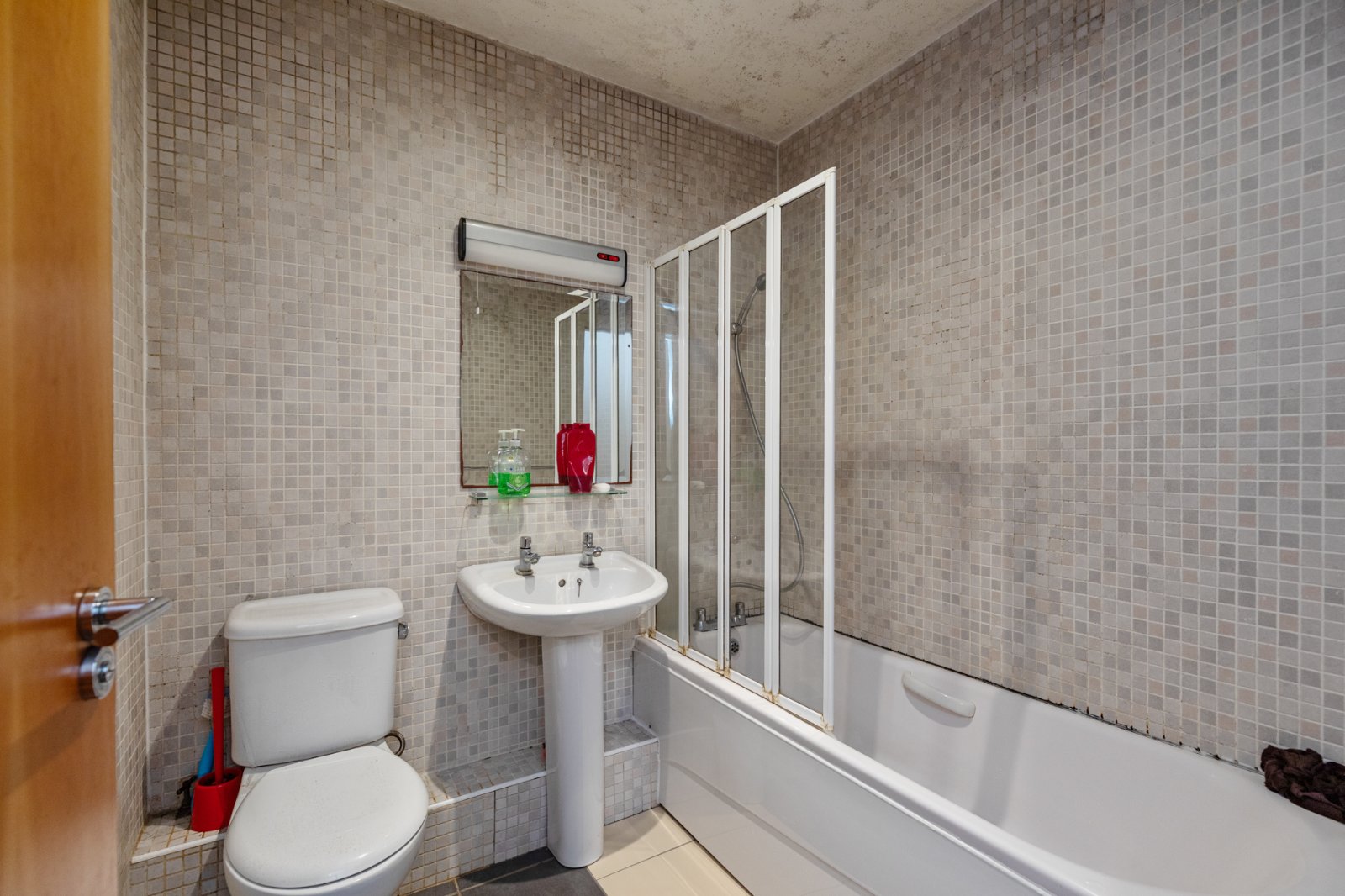 White suite comprising low flush WC. Pedestal wash hand basin. Fully tiled shower enclosure with thermostatic shower. Extractor fan. Fully tiled walls.
