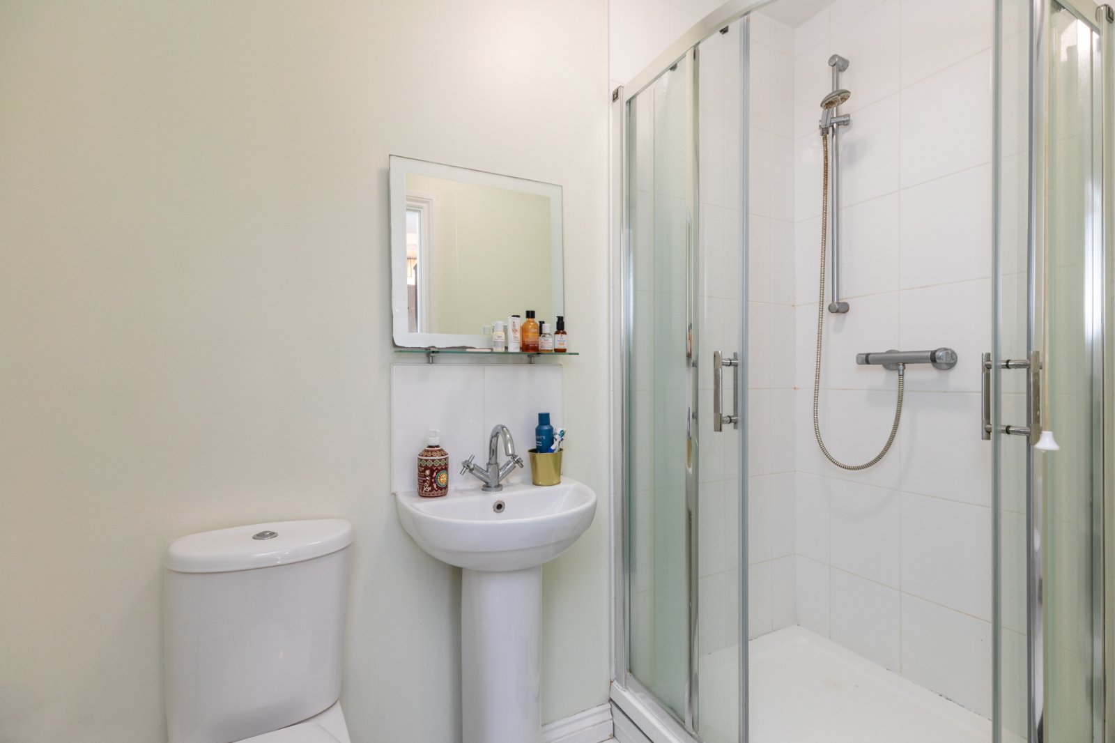 Modern suite comprising WC, wash hand basin and corner shower cubicle