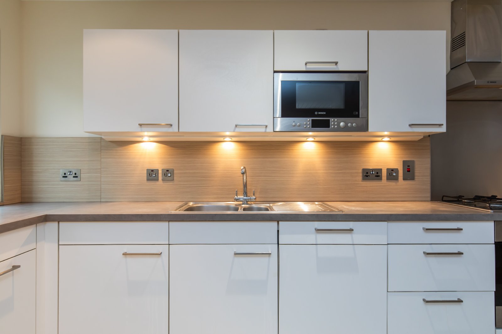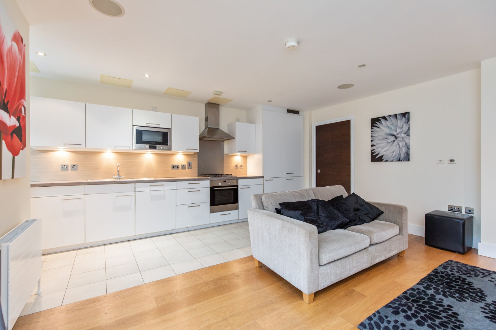 Contemporary fitted kitchen with excellent range of units and integrated appliances. Tiling to kitchen area, wood effect flooring to living room. Sliding patio door to decked balcony.