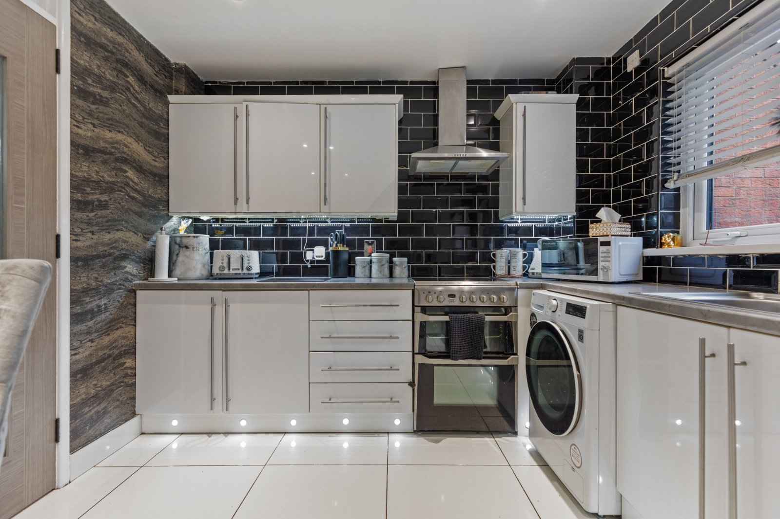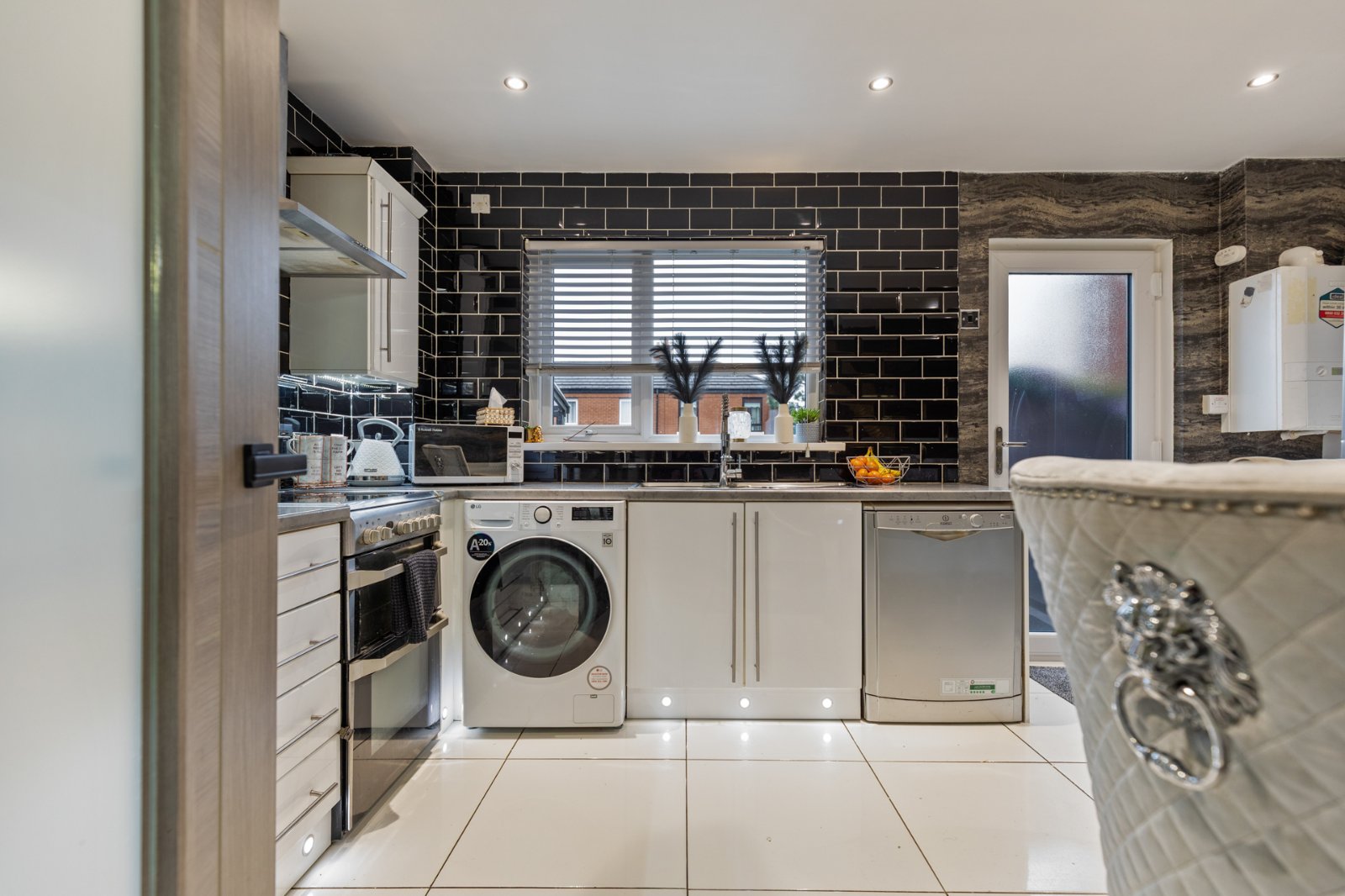 Matching tiled floor, range of high and low level units, integrated appliances, gas boiler, uPVC door to rear