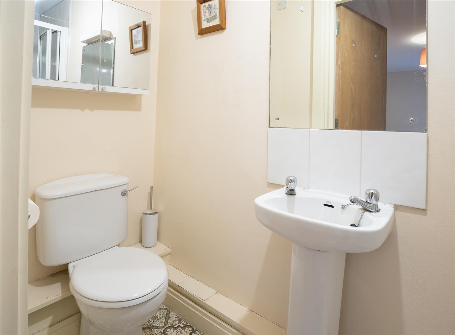 A private shower room, with low flush w/c, ceramic sink, enclosed shower cubicle, tile floor