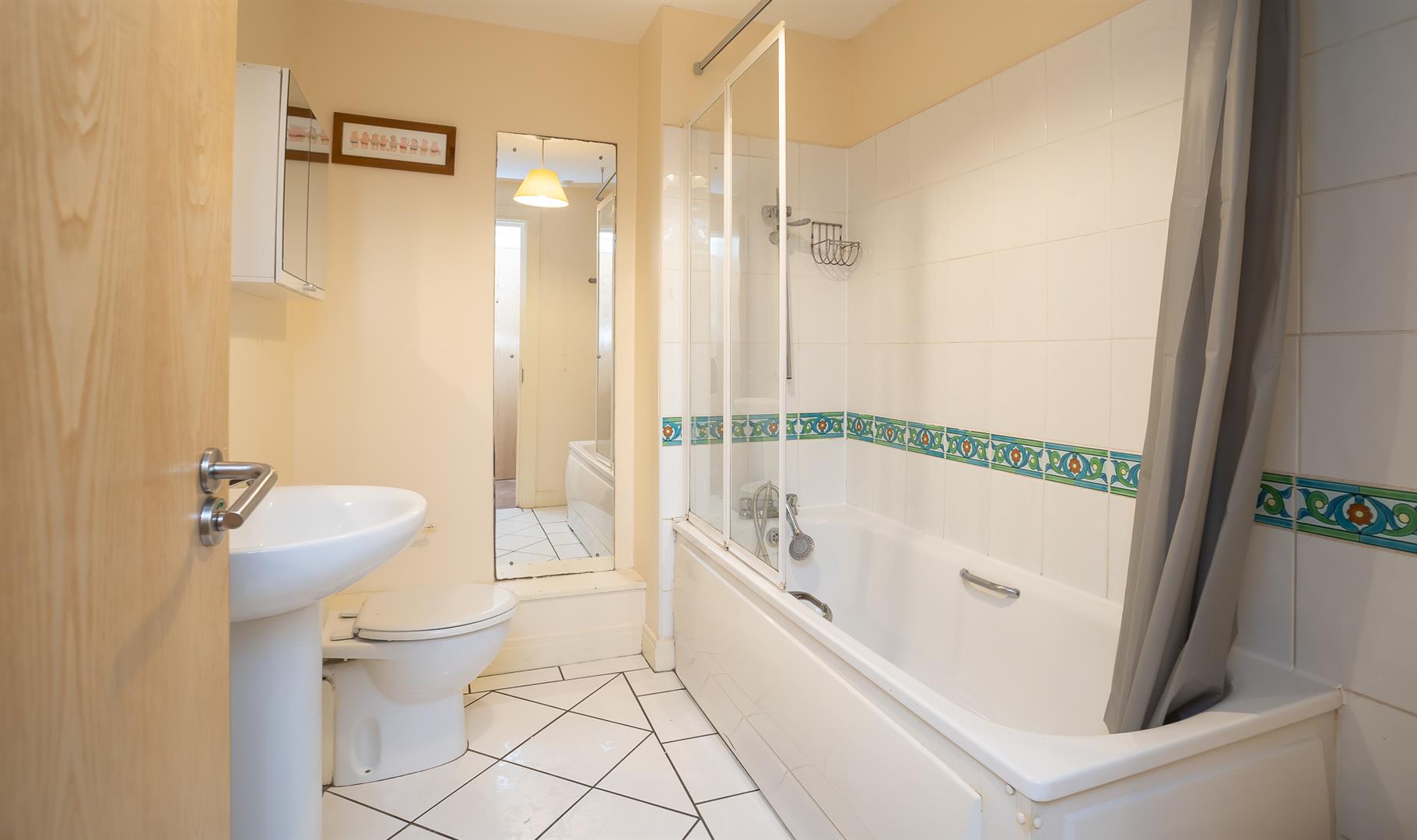 Partially tiled bathroom with shower over bath, tiled floor, low flush W/C, sink and mirrored storage cabinet.