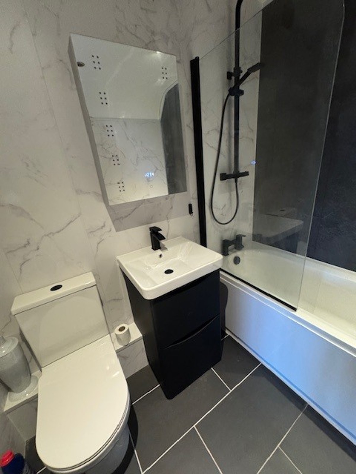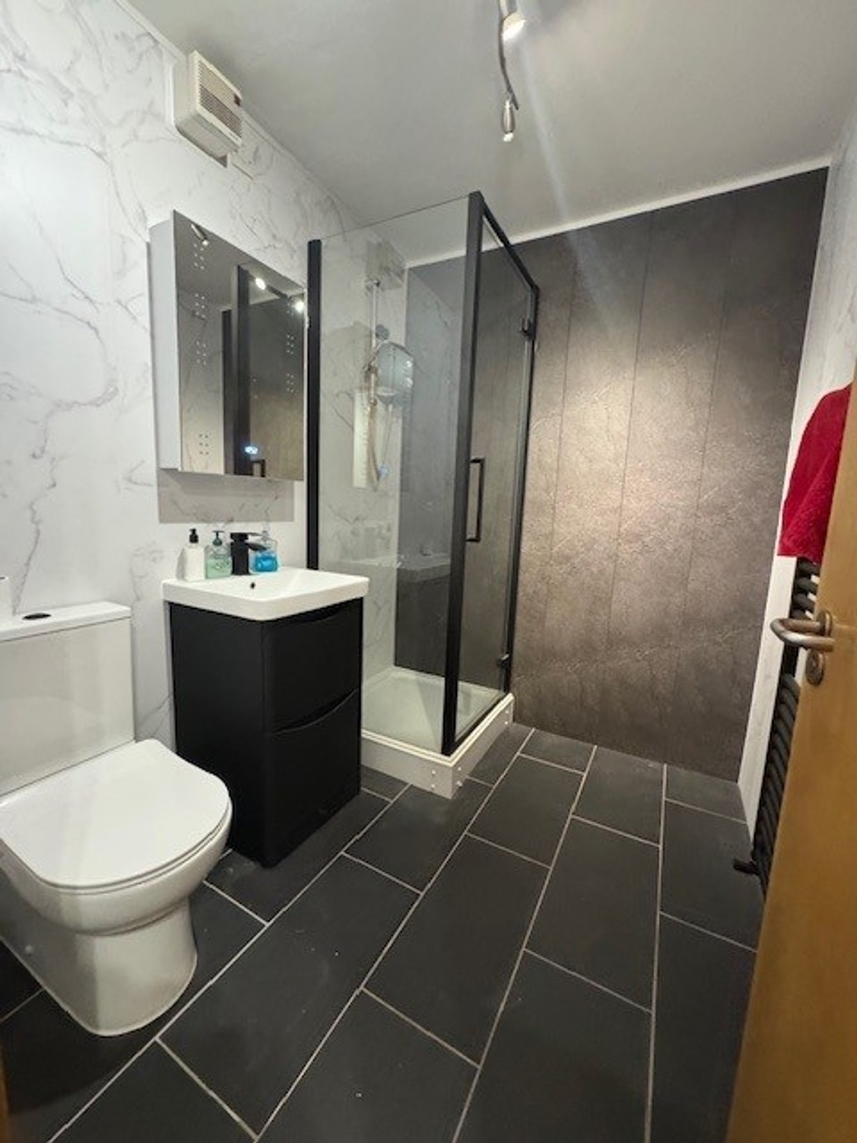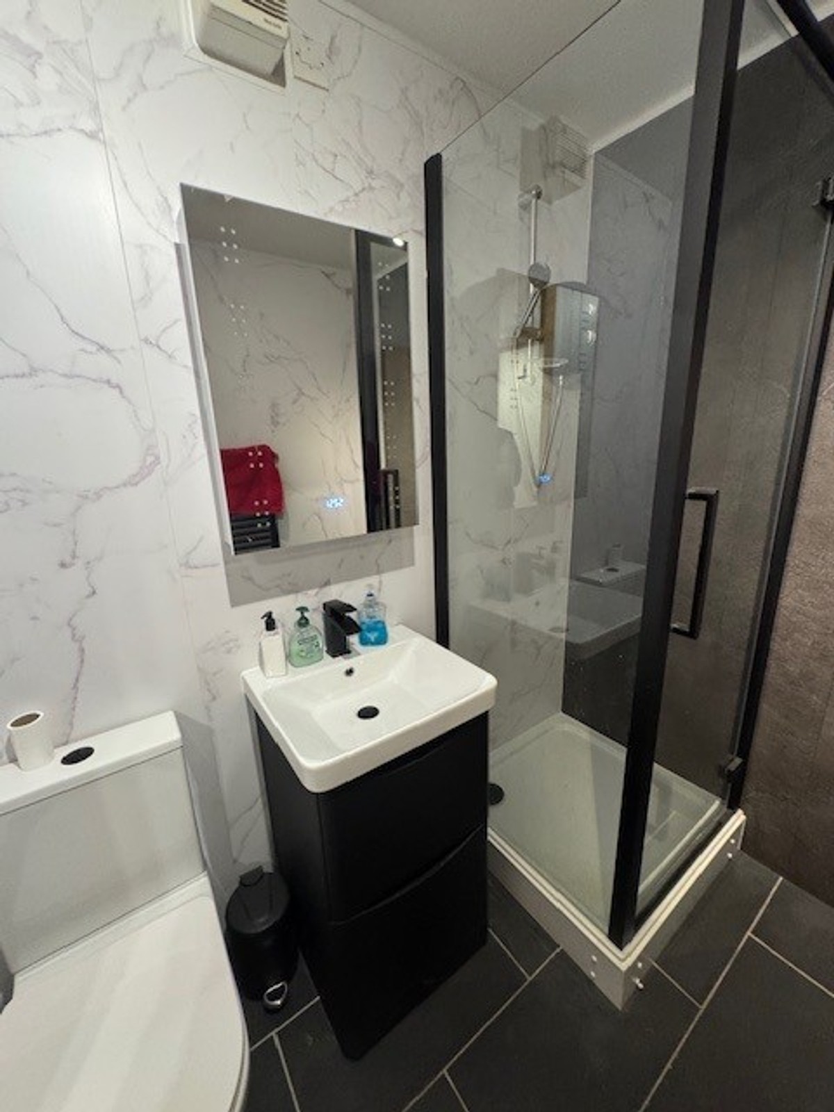This bright and spacious home features 3 double bedrooms, including a ground-floor bedroom, 2 modern bathrooms with black shower features and LED backlit mirrors, a large open-plan lounge/dining area, and a solid wood kitchen with oak-effect worktops and integrated appliances.