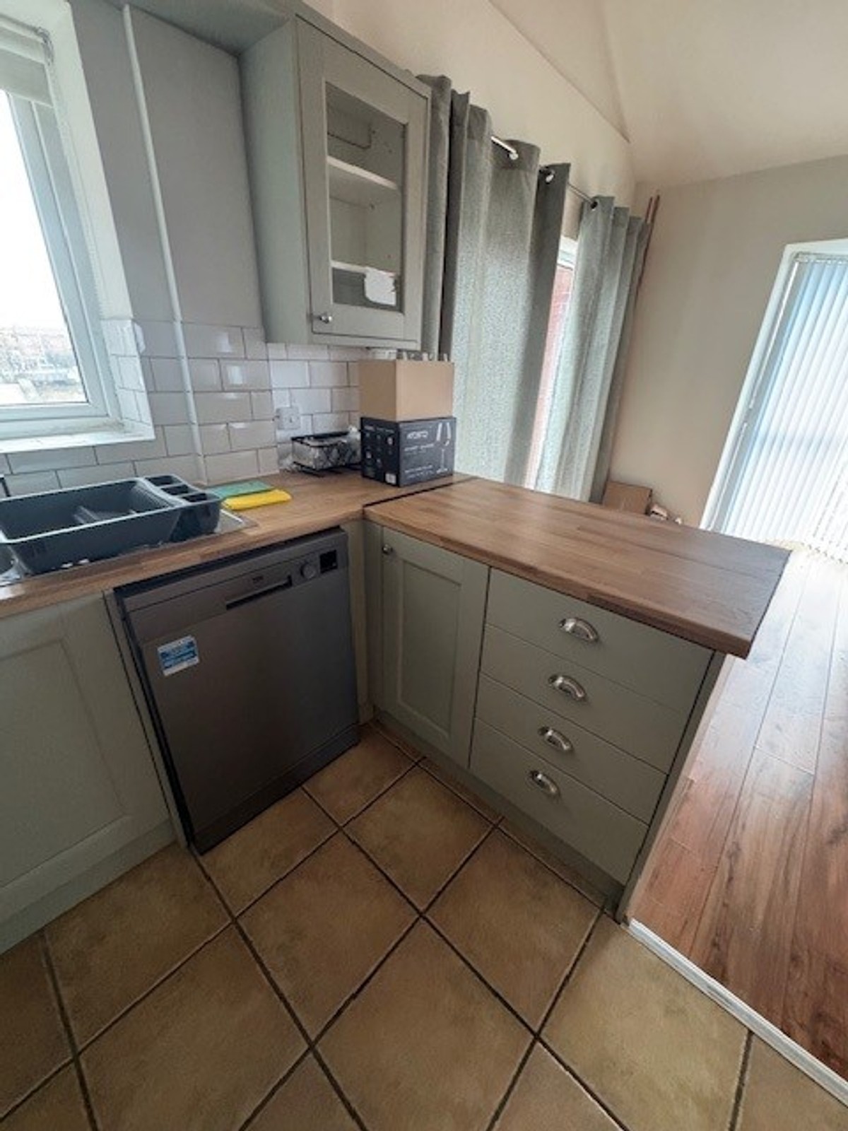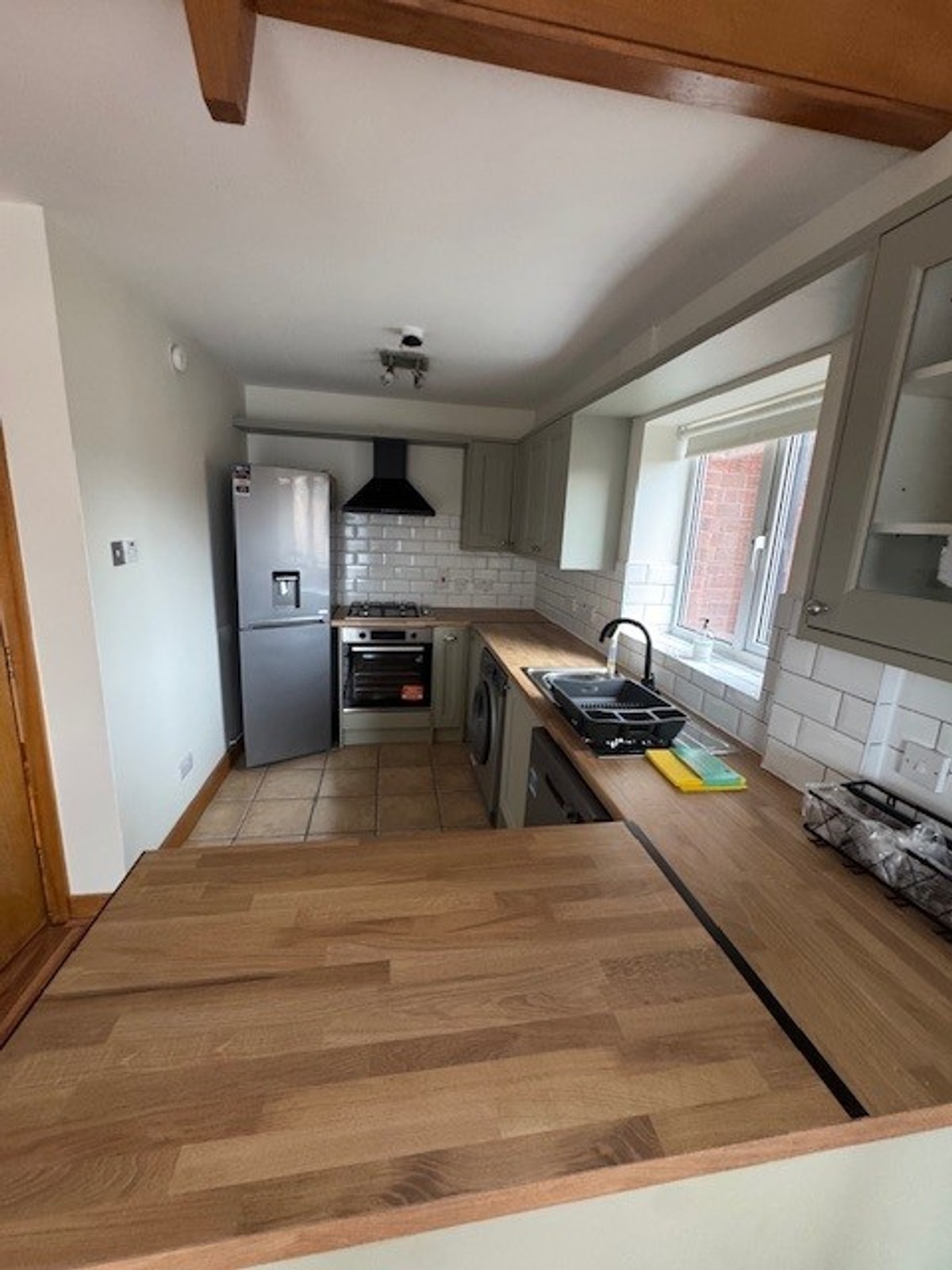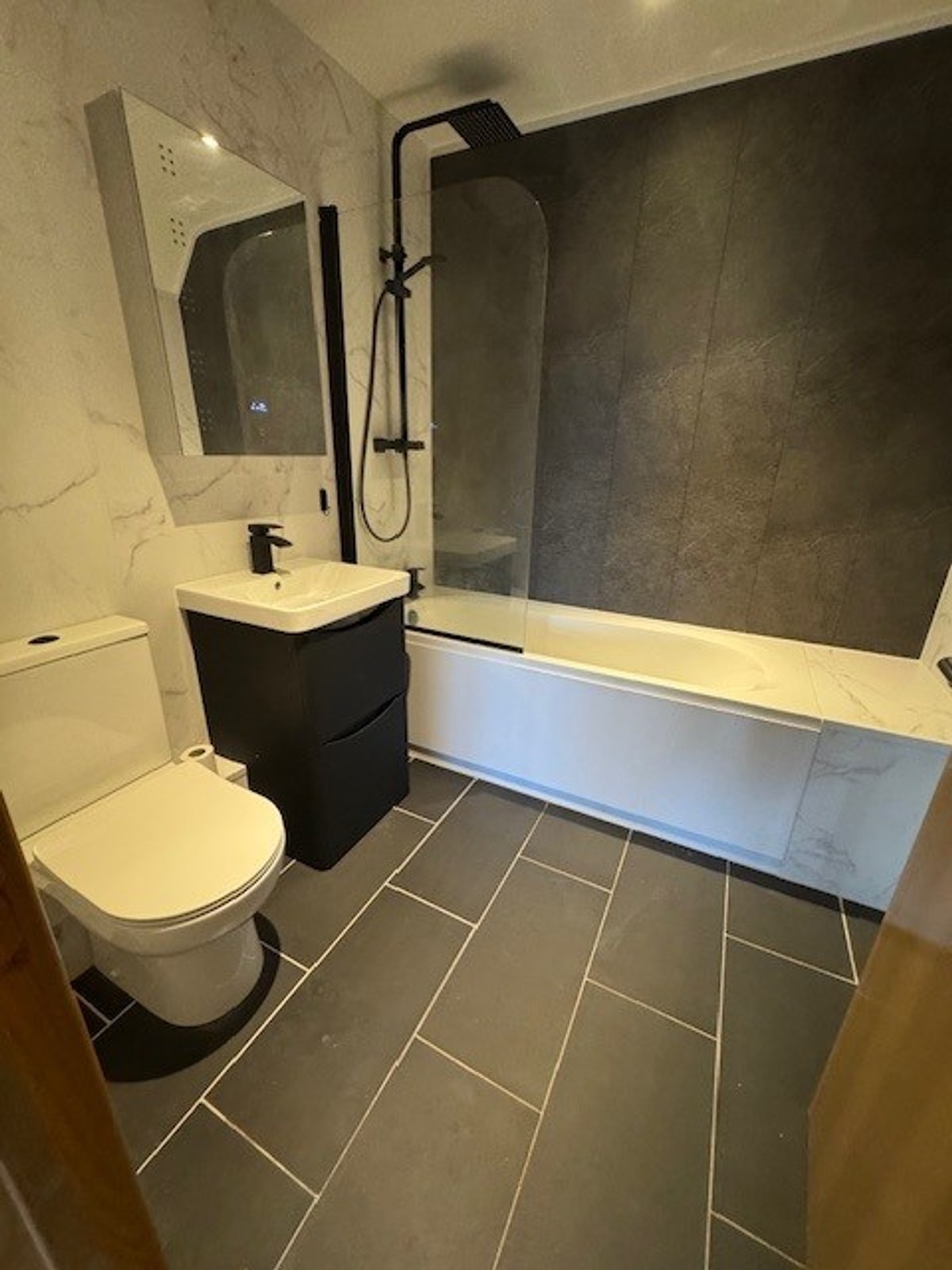 This bright and spacious home features 3 double bedrooms, including a ground-floor bedroom, 2 modern bathrooms with black shower features and LED backlit mirrors, a large open-plan lounge/dining area, and a solid wood kitchen with oak-effect worktops and integrated appliances.
