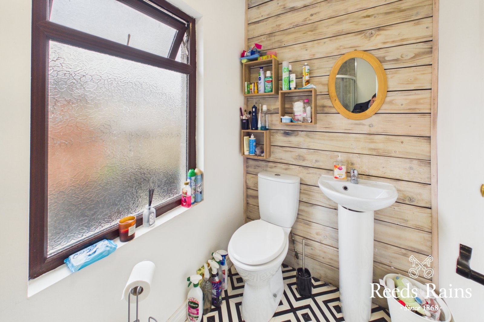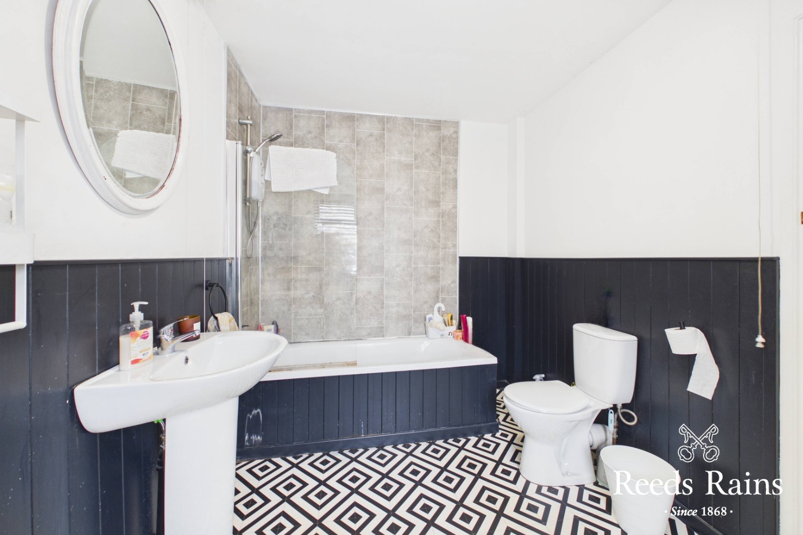 Panel bath with shower screen and shower unit. Low flush WC. Pedestal wash hand basin. Part tiled, part wood panelled walls.