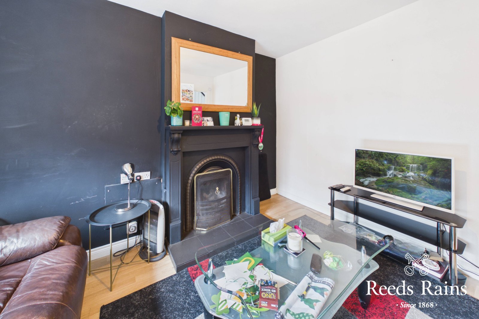 Feature fire place. Wooden floor.