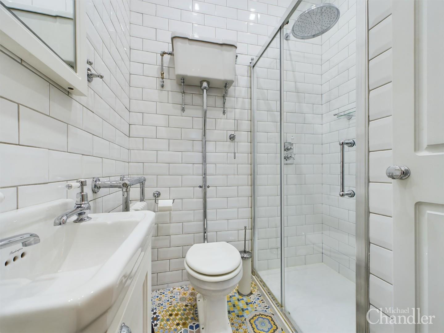 Ascending to the first floor, you will find a beautifully designed modern three-piece bathroom featuring a sleek wet-room-style shower and classic detailing. The master bedroom includes a pocket door leading to a second stylish en-suite bathroom, seamlessly combining luxury and efficiency.