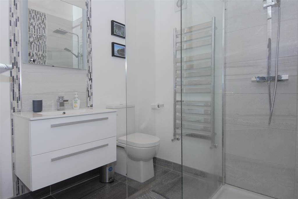 Tiled floor, double shower with tiled splashback, wash hand basin with vanity unit, low flush WC and heated towel rail