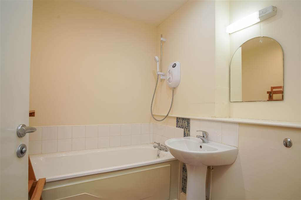 Three piece suite with panel bath, electric shower, wash hand basin, toilet, laminate flooring and recessed lighting.