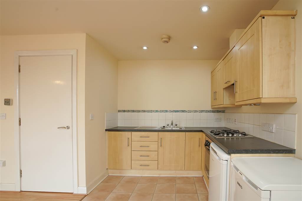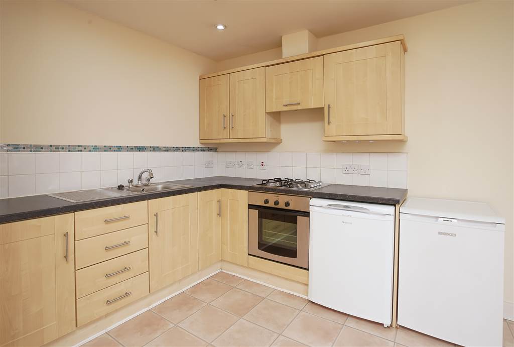 Kitchen with laminate worksurfaces, stainless steel sink and drainer, four ring gas hob, tiled flooring. Open plan to living space.