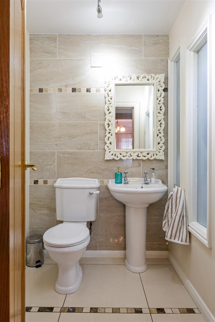 Low flush w.c, pedestal wash hand basin, chrome effect sanitary ware, beautiful partially tiled walls and tiled floor, extractor fan.