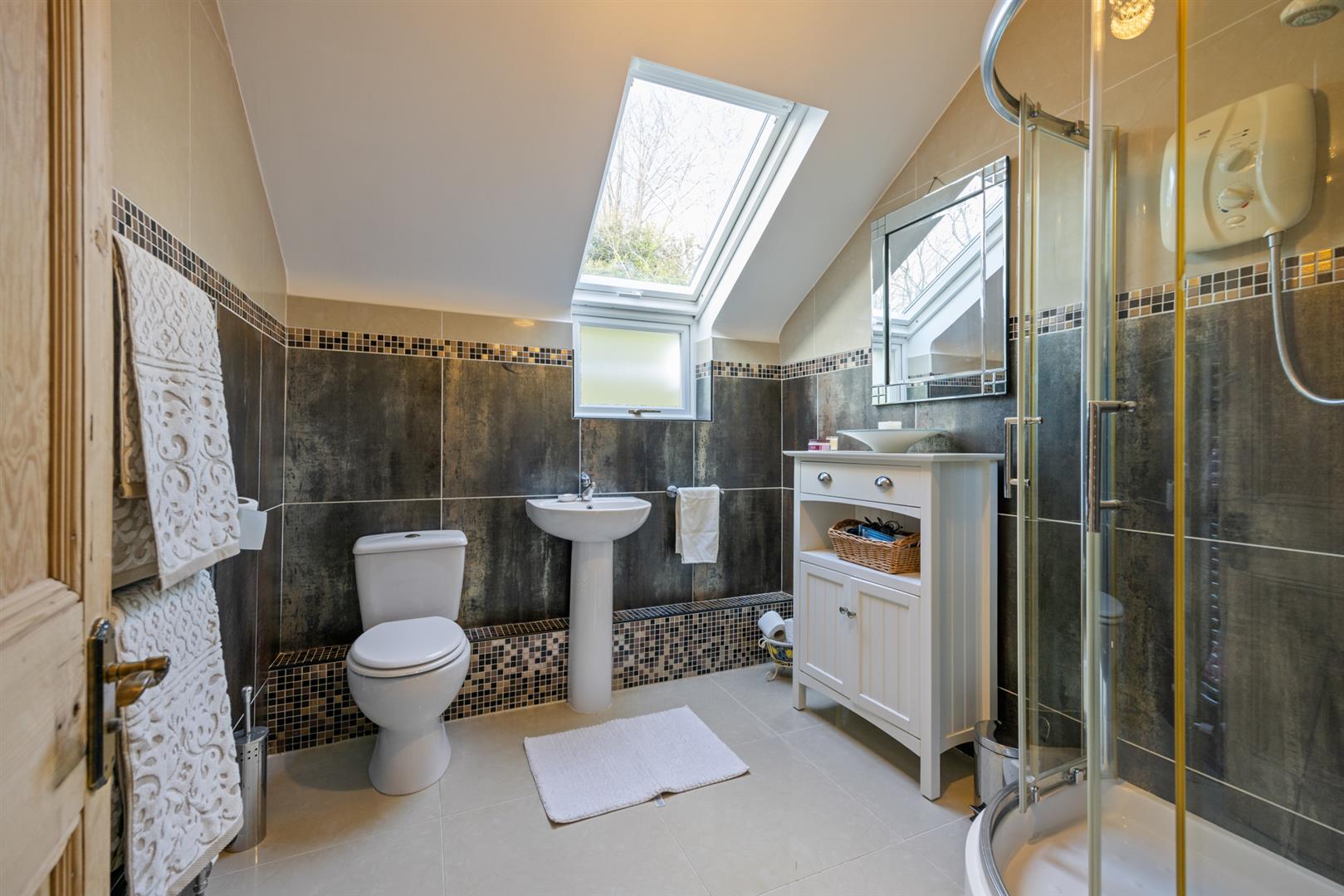 Shower cubicle, electric shower unit, low flush w.c, pedestal wash hand basin, chrome effect towel warmer, chrome effect sanitary ware, extractor fan, velux window, beautiful tiled walls and floor.