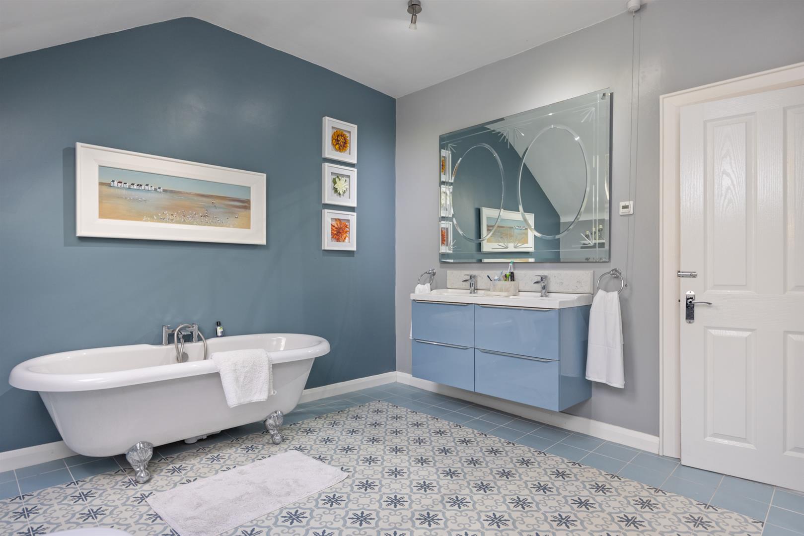 Feature roll top bath, separate large shower cubicle, thermostatically controlled shower unit, feature double sinks and extractor fan, storage units ( wall hung ), chrome effect sanitary ware, under floor heating, beautiful partially tiled walls and floor.