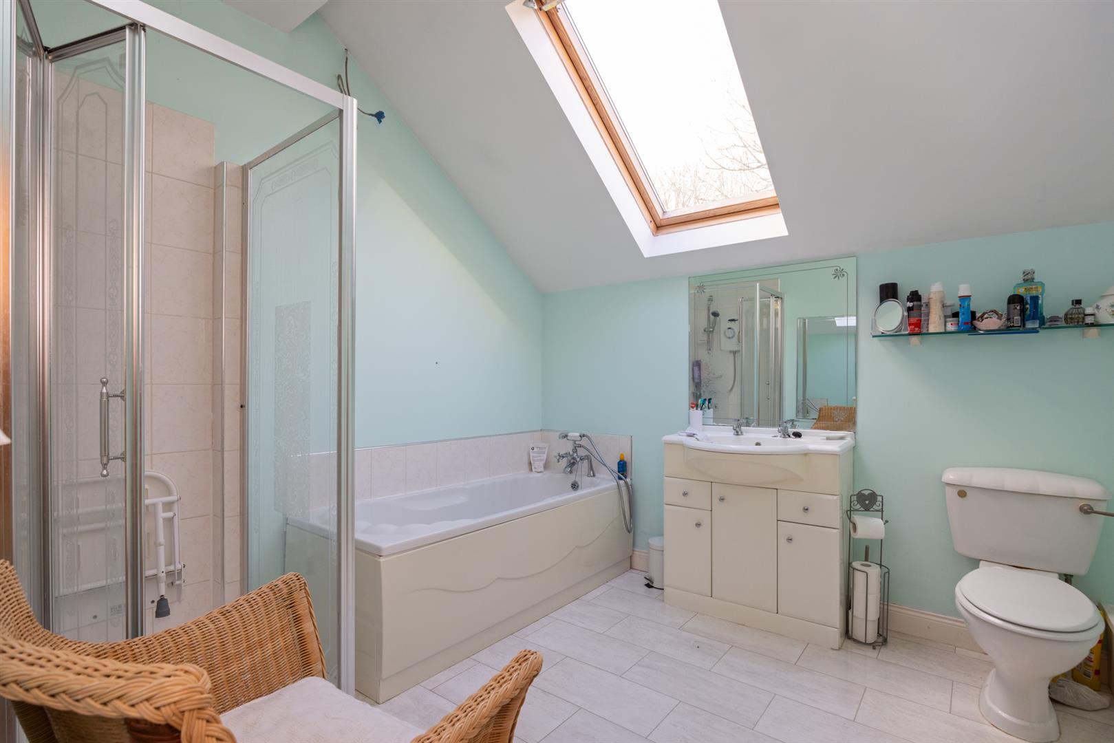 Bath with mixertaps, telephone hand shower, separate shower cubicle, electric shower unit, low flush w.c, wash hand basin and storage unit, chrome effect sanitary ware, towel warmer, velux window, partially tiled walls.