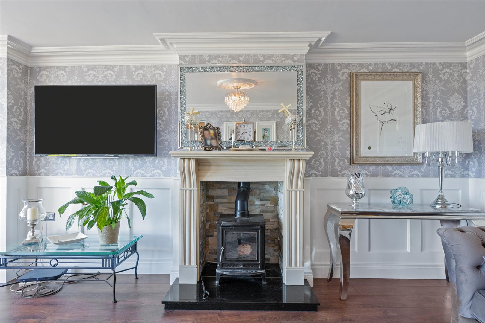 Wooden effect strip floor, feature picture window, cornicing, centre rose, attractive fireplace, feature wood burning stove, wood panelling.