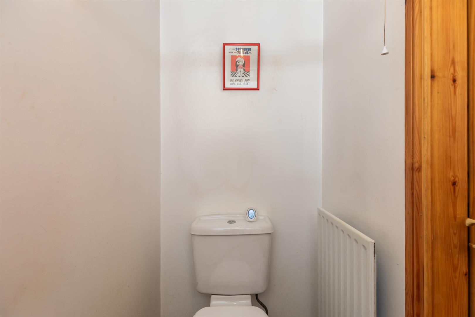Pedestal wash hand basin, low flush wc, ceramic tiled floor, panelled radiator.